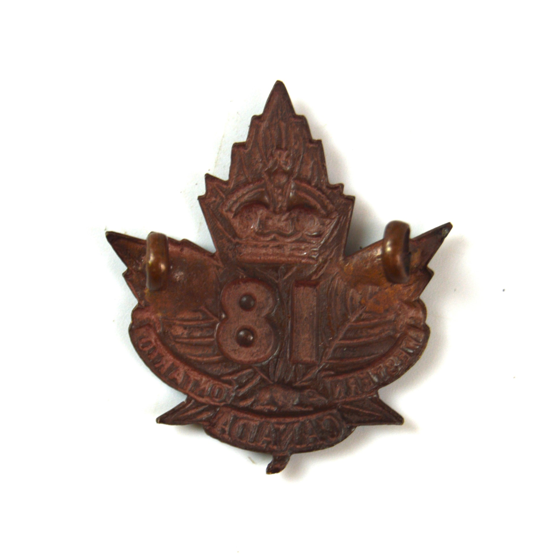 An original cap badge issued to the 18th (Western Ontario) Battalion, Canadian Expeditionary Force (CEF), dating from the First World War period. The badge features the Maple Leaf backing with the central “18” and scrolls reading “WESTERN ONTARIO / CANADA”, executed in a dark copper finish typical of Canadian Expeditionary Force dress and service uniforms. Designed for attachment to peaked caps or service headdresses, the badge reflects the standard pattern and construction of early 20th-century Canadian military insignia. The reverse is fitted with original lugs or fastenings for secure attachment.