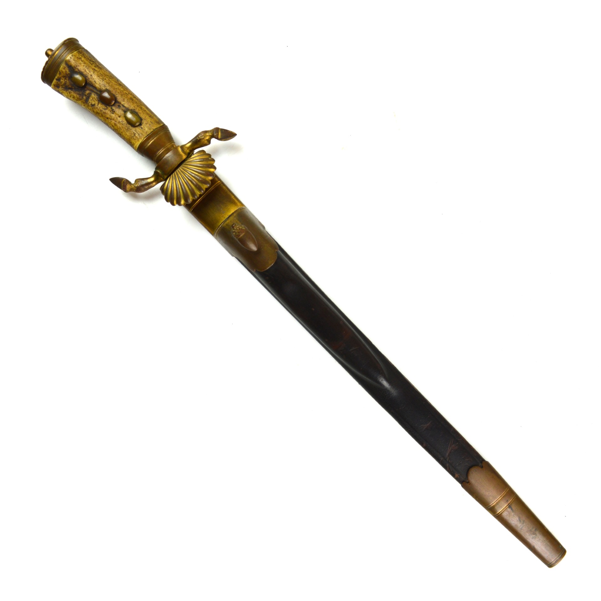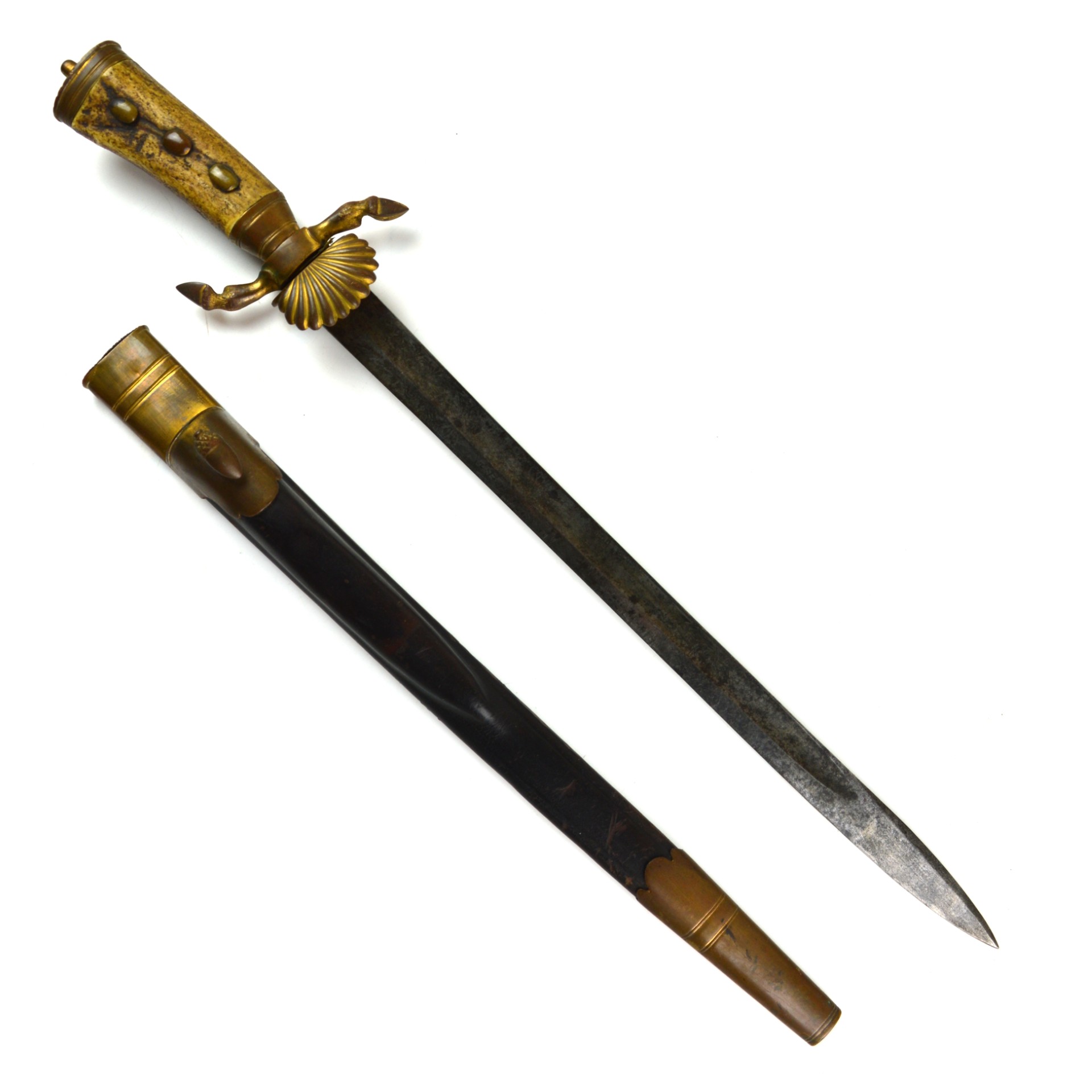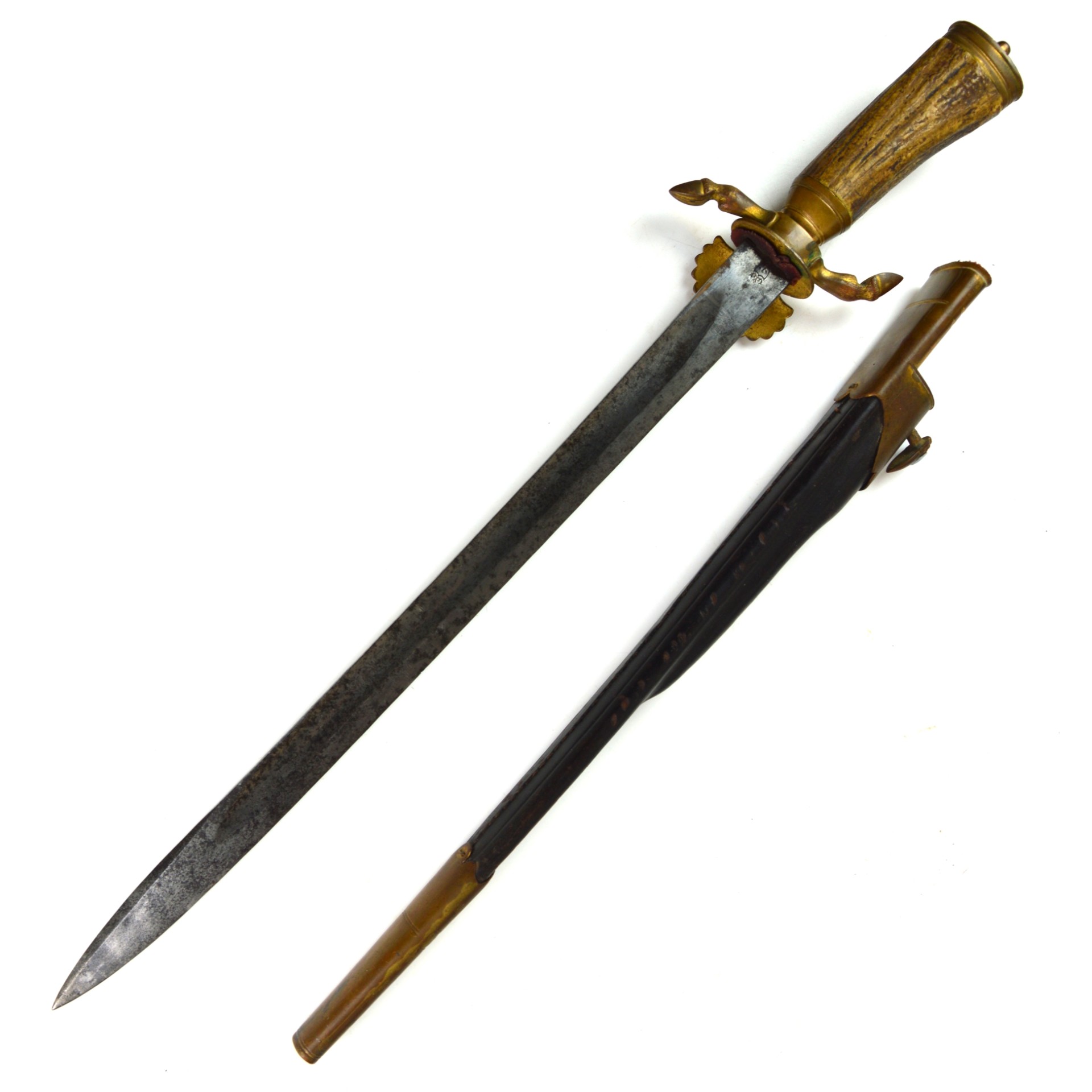 The Hirschfänger features a straight, single-edged and fullered blade with a sharpened clip point. The blade retains some of its original etching with a fair amount of discolouration and age-related patina. The hilt displays ornate brass mounts, including a crossguard with a clamshell guard and hoove quillions. The grip is made of stag antler, held in place with 3 large brass rivets, all typical of 19th-century German craftsmanship. The sword fits snugly into its leather scabbard, which is mounted with matching brass fittings at the throat and chape. This brass furniture would’ve originally been gilt-plated; however, most of it has worn away