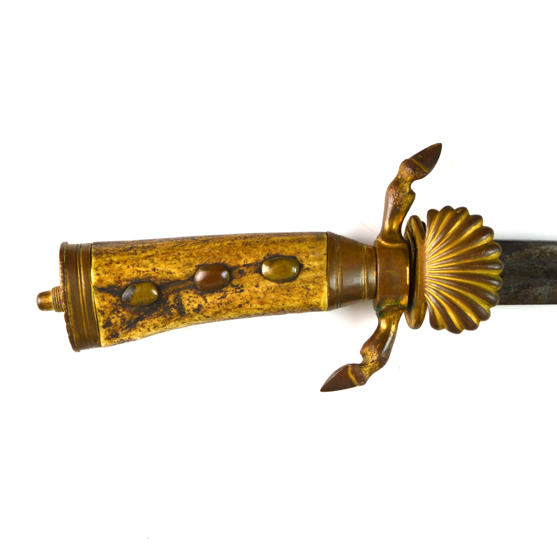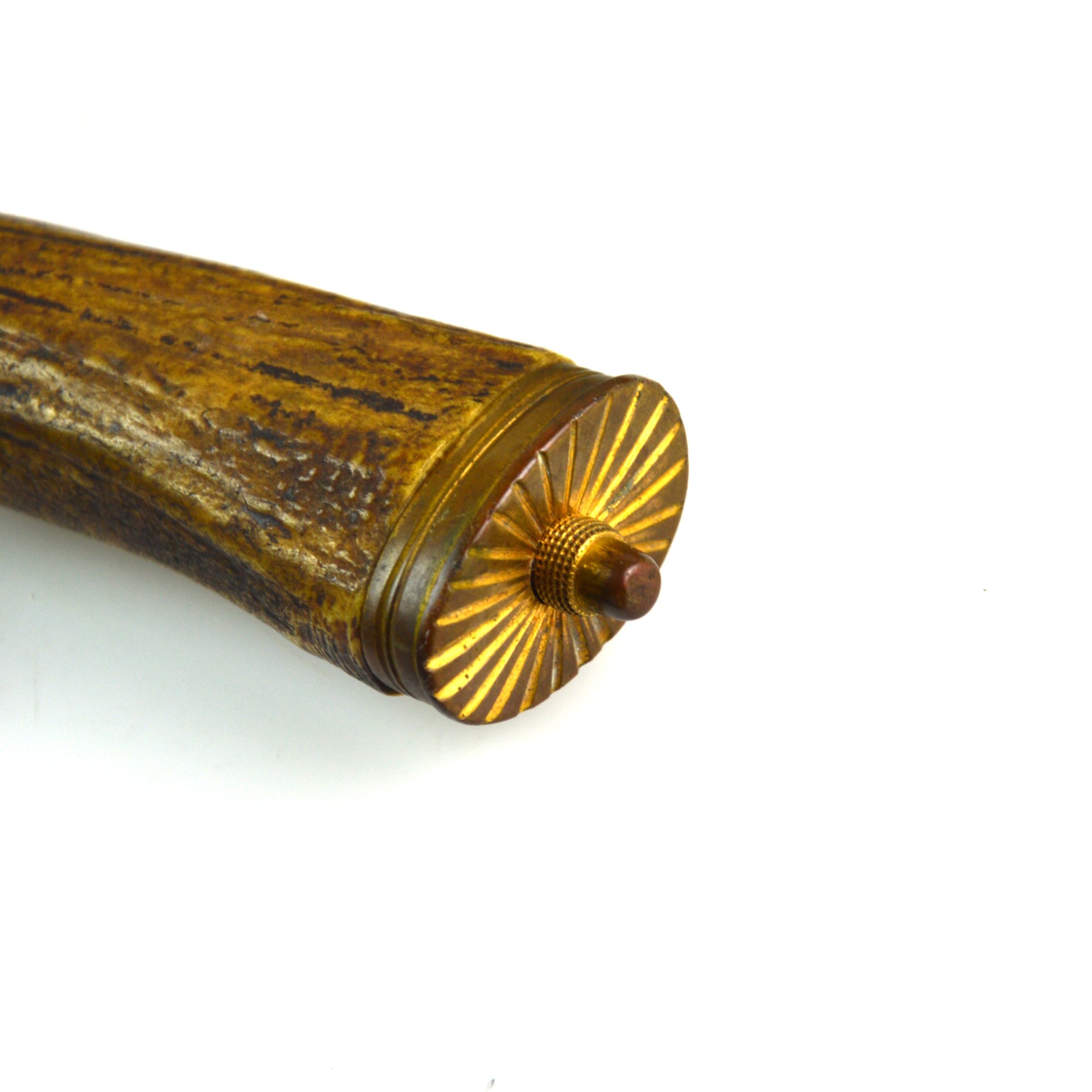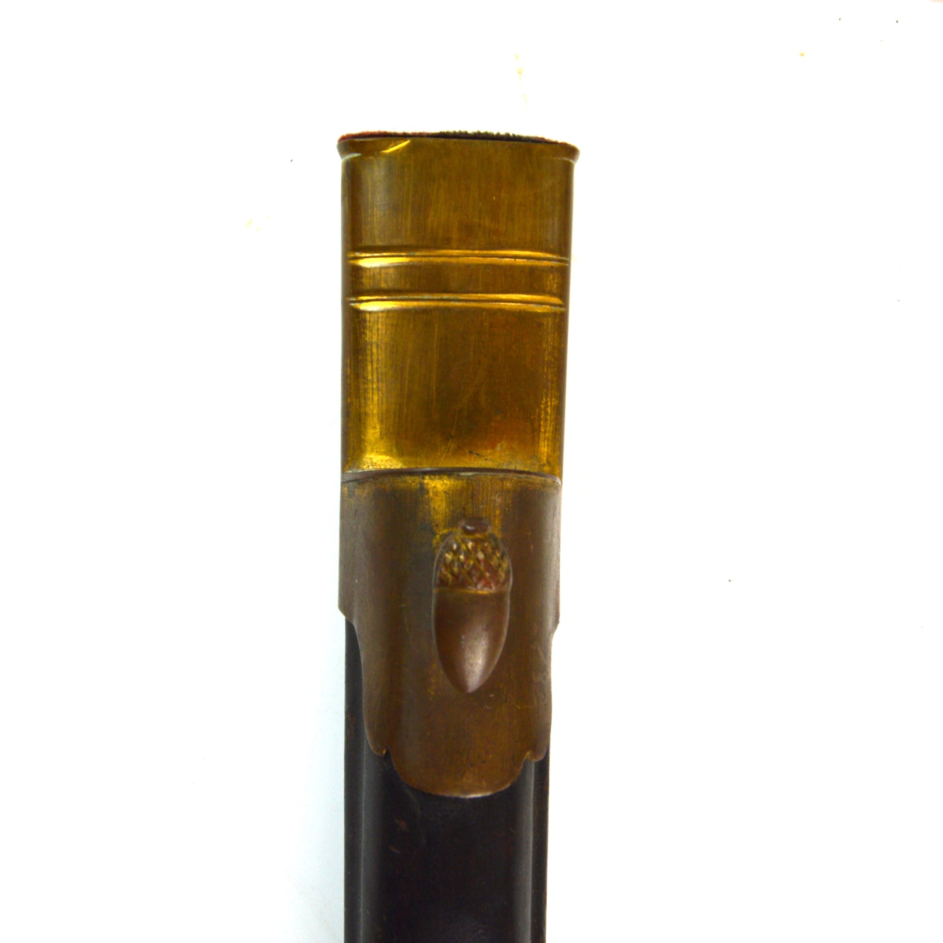 The Hirschfänger features a straight, single-edged and fullered blade with a sharpened clip point. The blade retains some of its original etching with a fair amount of discolouration and age-related patina. The hilt displays ornate brass mounts, including a crossguard with a clamshell guard and hoove quillions. The grip is made of stag antler, held in place with 3 large brass rivets, all typical of 19th-century German craftsmanship. The sword fits snugly into its leather scabbard, which is mounted with matching brass fittings at the throat and chape. This brass furniture would’ve originally been gilt-plated; however, most of it has worn away
