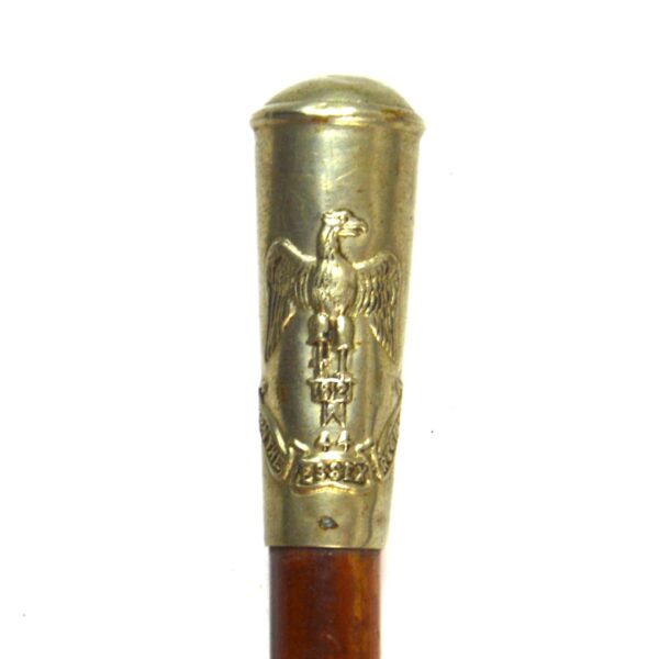 A British officer’s swagger stick, featuring a traditional design with a polished cane shaft and a white metal cap featuring the insignia of the Essex Regiment (Salamanca Eagle) with the scroll “1st Bn. The Essex Regiment” below. These swagger sticks were carried by officers and senior NCOs as part of their formal dress, especially during parades, inspections, and ceremonial duties.