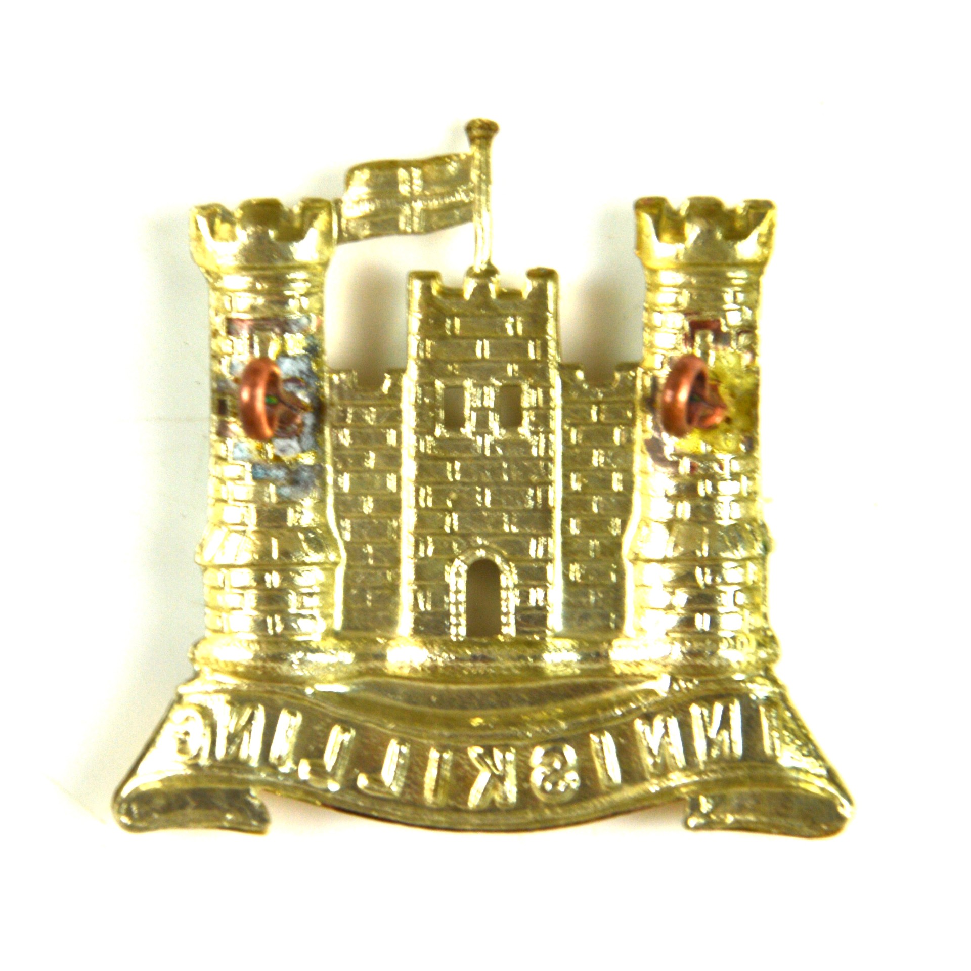 6th (Inniskilling) Dragoons cap badge produced as a restrike of the pre-1922 pattern worn prior to the regiment’s amalgamation in 1922. This British Army cavalry cap badge displays the recognised insignia of the 6th (Inniskilling) Dragoons in clear relief, incorporating the regiment’s traditional castle device with a scroll bearing the title “Inniskilling,” arranged in a formal composition characteristic of cavalry headdress insignia. The design reflects the regiment’s Irish heritage and its service during the Boer War and the First World War period.