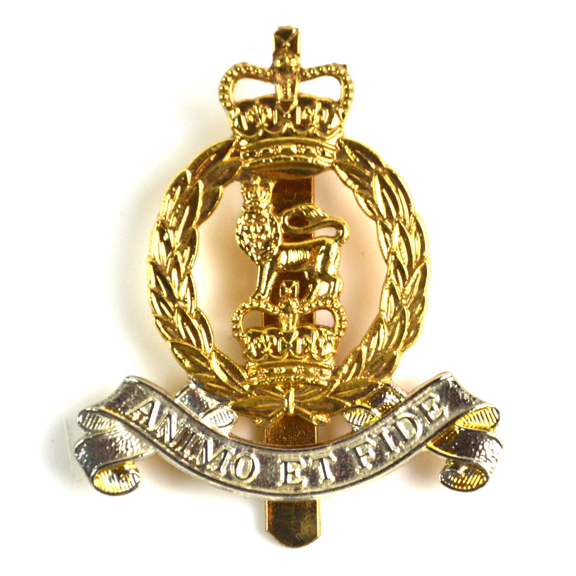 An officer’s cap badge of the Adjutant General’s Corps (AGC), featuring the Queen’s Crown and produced in gilt and silver plate finish. This British Army officer’s insignia displays the recognised AGC design in well-defined relief, incorporating the Royal Lion standing on the Queen’s Crown within a wreath, with a scroll below that reads the corps’ official motto “Animo et Fide” (With resolution and fidelity). Intended for wear on officer service dress caps, it represents a quality example of AGC insignia, modern British Army militaria, and Queen’s Crown collectable military badges. The reverse is fitted with a standard hook slider for secure attachment.