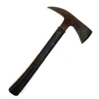 Antique Forestry Hunting Sword, made by Tjikroeh in Indonesia and dated 1/4/1904 on the ricasso. 403mm (15 15/16″) single-edged blade with engravings in the fuller, white metal (nickel) shell shaped cross guard with hoof-shaped finial, horn grip with 3 white metal studs and white metal stylised pommel. Dark brown scabbard with white metal locket.
