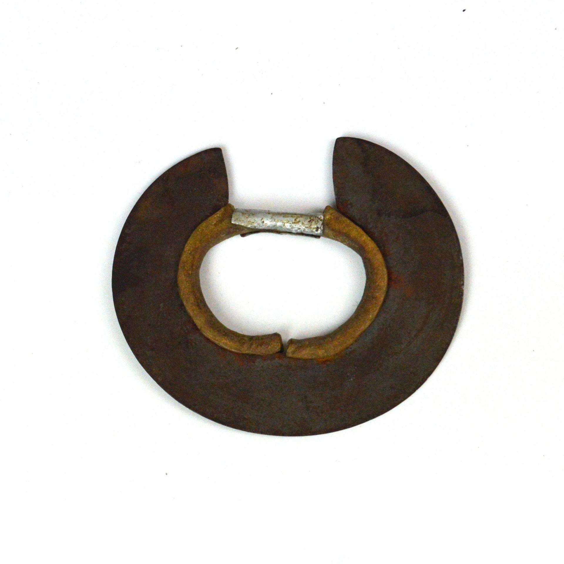 Sudanese Armlet Wrist Knife, used for ceremonial dancing in the Southern Sudan. Quite sharp edged flat ‘broken’ circular disk with central hole and leather wrist protector.