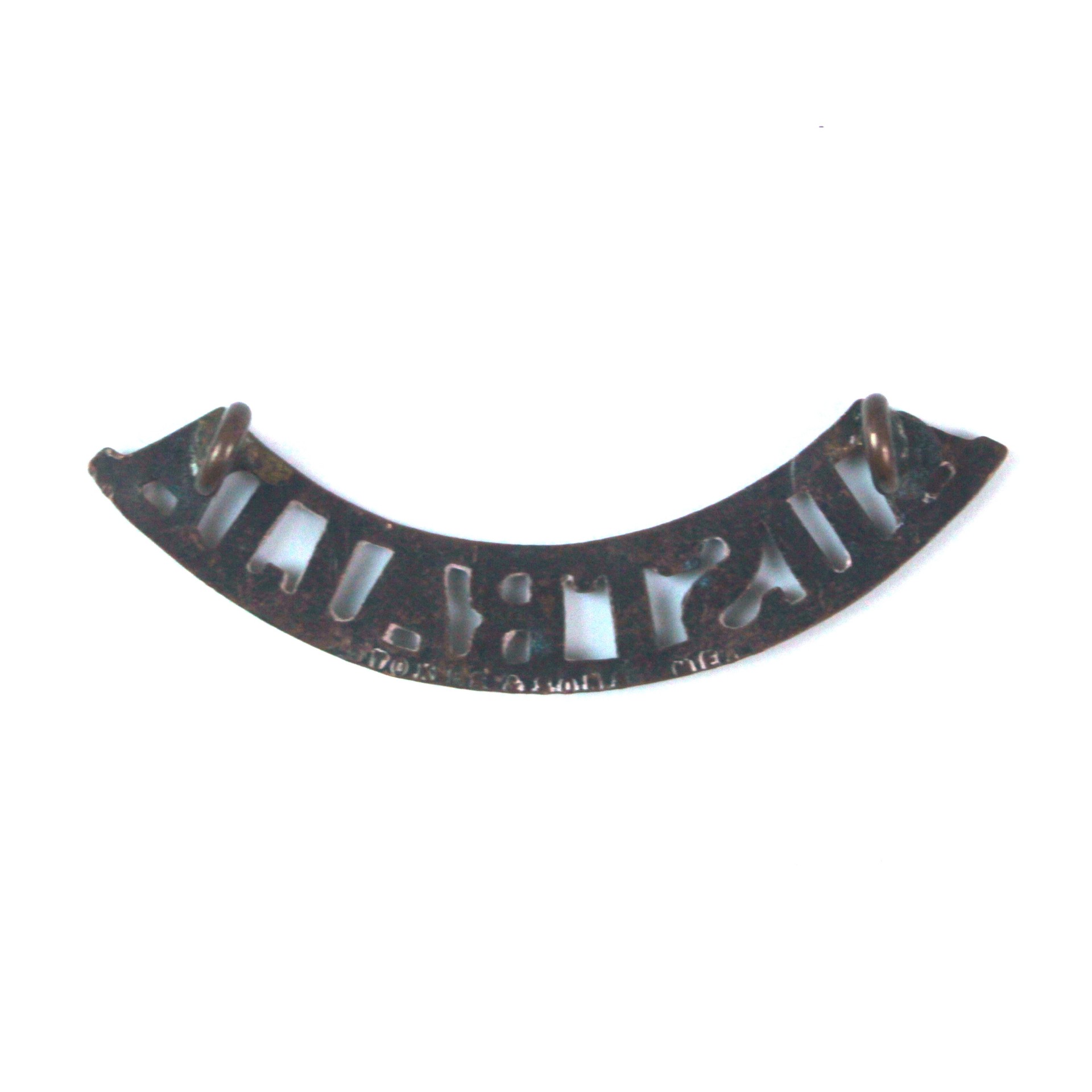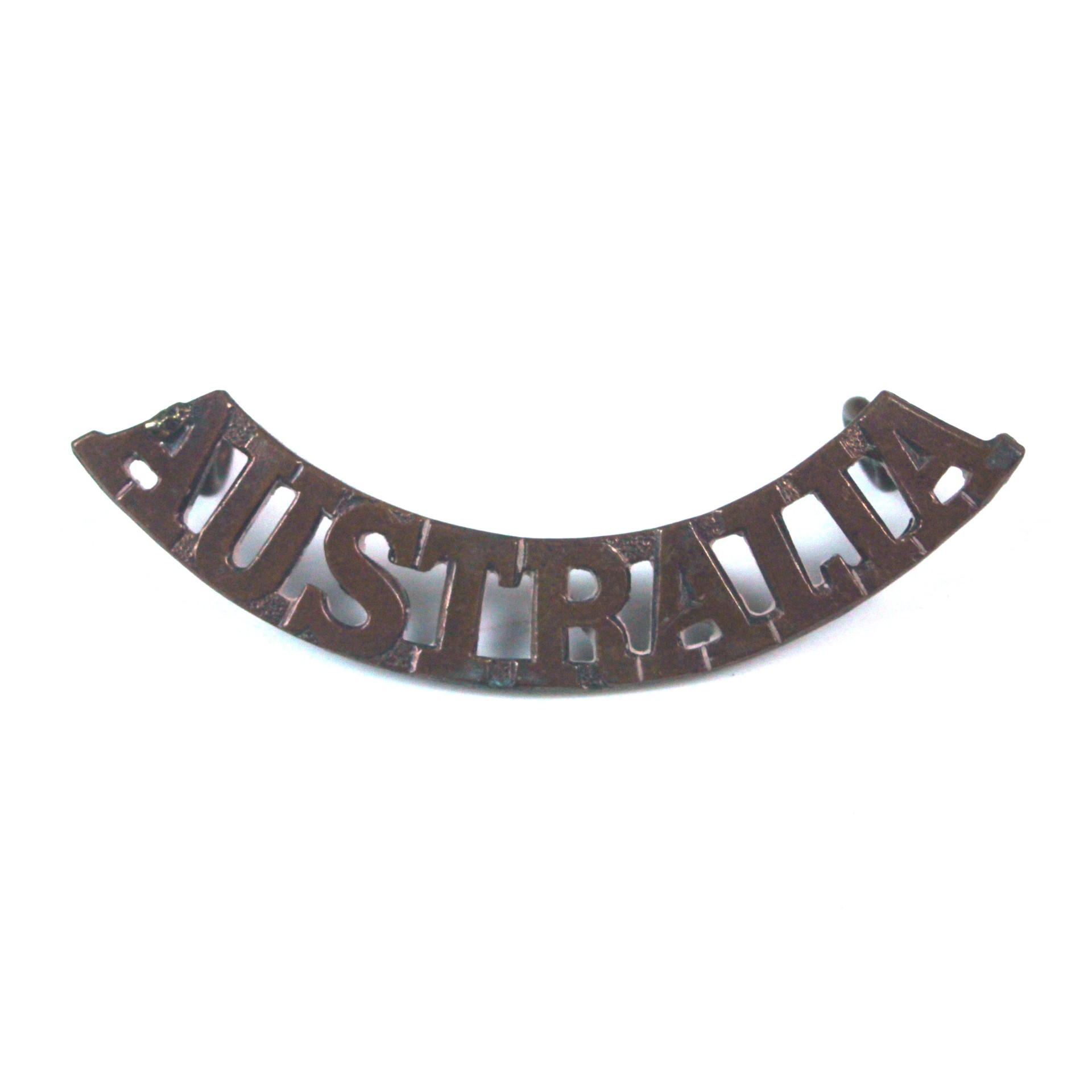 An original bronzed shoulder title reading “AUSTRALIA”, as worn by members of the Australian Military Forces during both World War I and World War II. This example is marked by the Australian manufacturer Stokes & Sons of Melbourne.