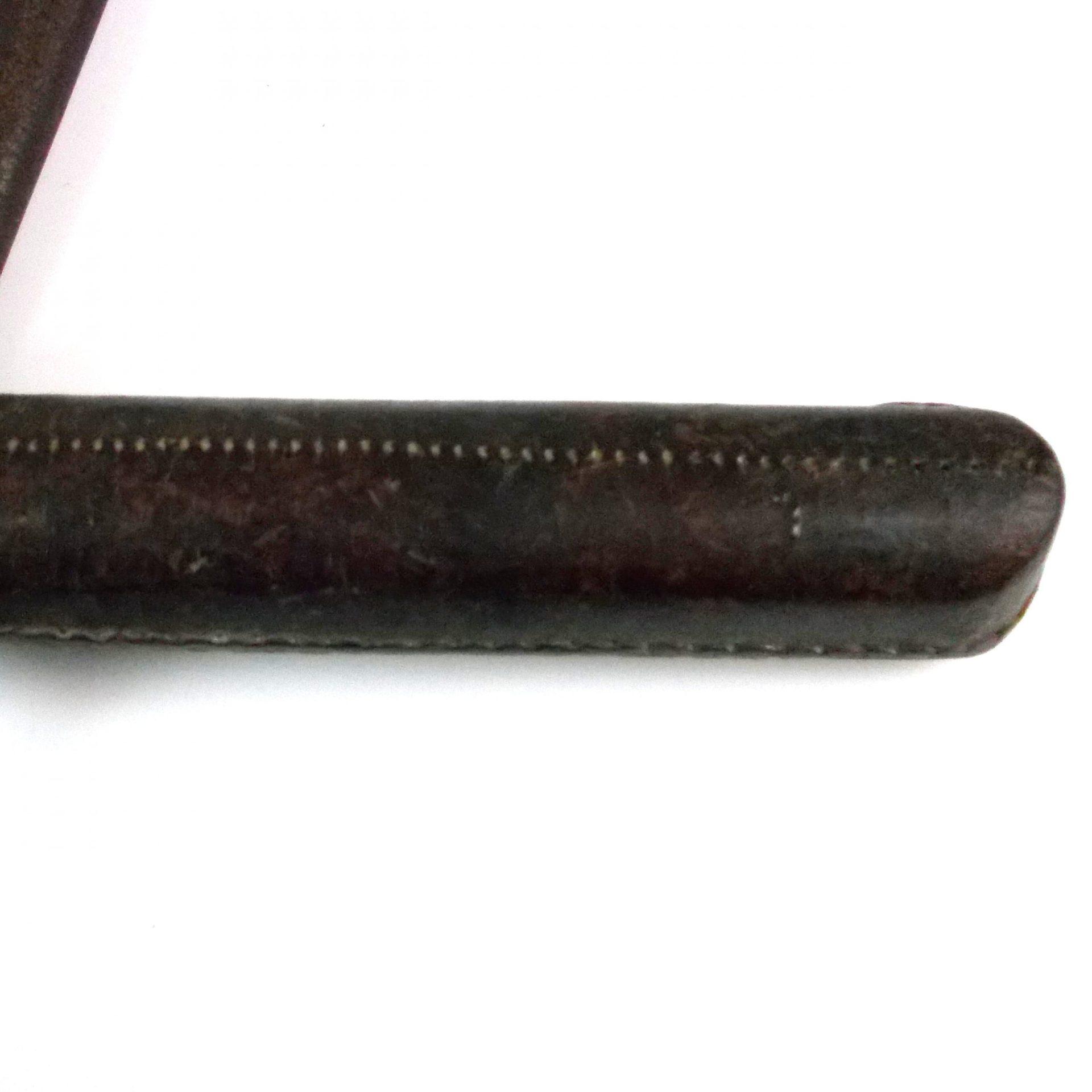 Wooden gripped with leather covering, 206mm single-edged blade, marked “R” on the ricasso, possibly Simon Redtenbacher Sensenwerke, Linz. Flat steel boat-shaped crossguard, 305mm overall.