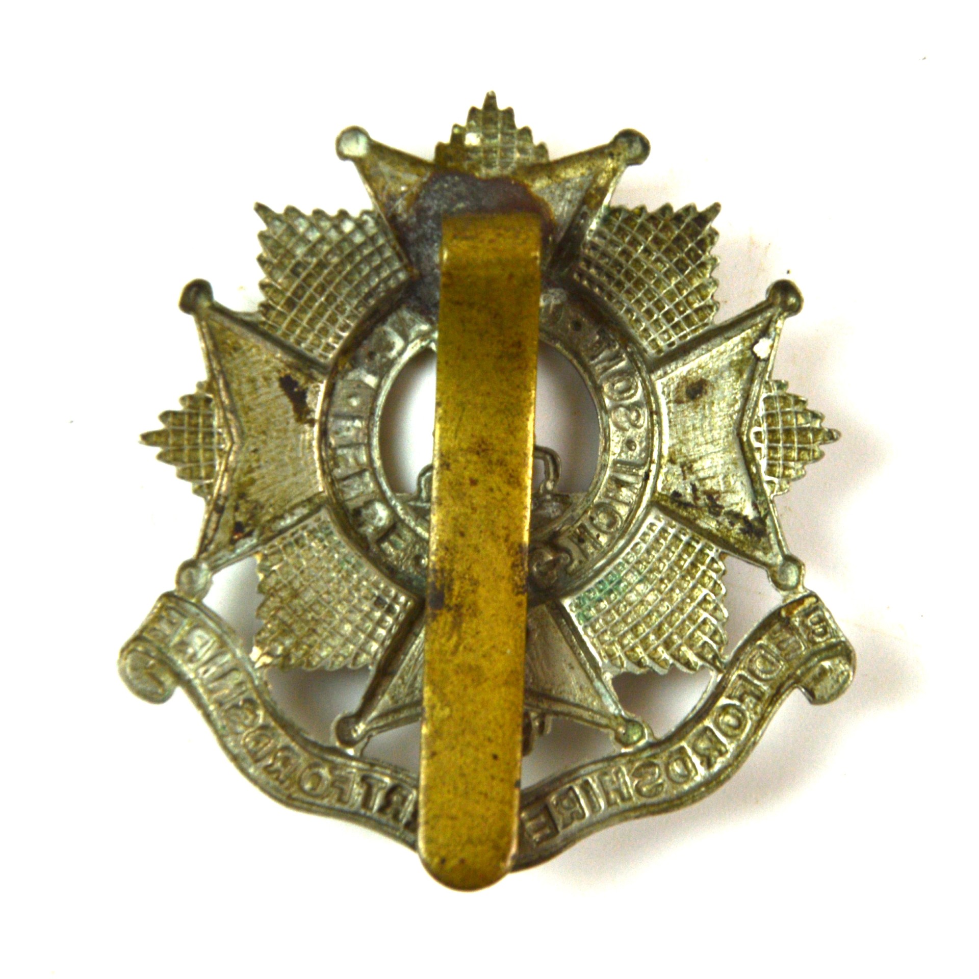 Struck in white metal, the badge displays the regiment’s distinctive Hart surrounded by the cirlcet with the Royal motto, with a scroll below reading “BEDFORDSHIRE & HERTFORDSHIRE”. This is a genuine period example with crisp detail and proper fittings.