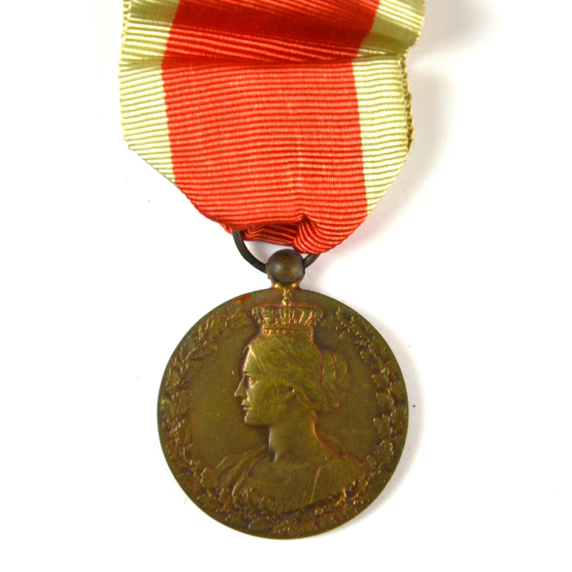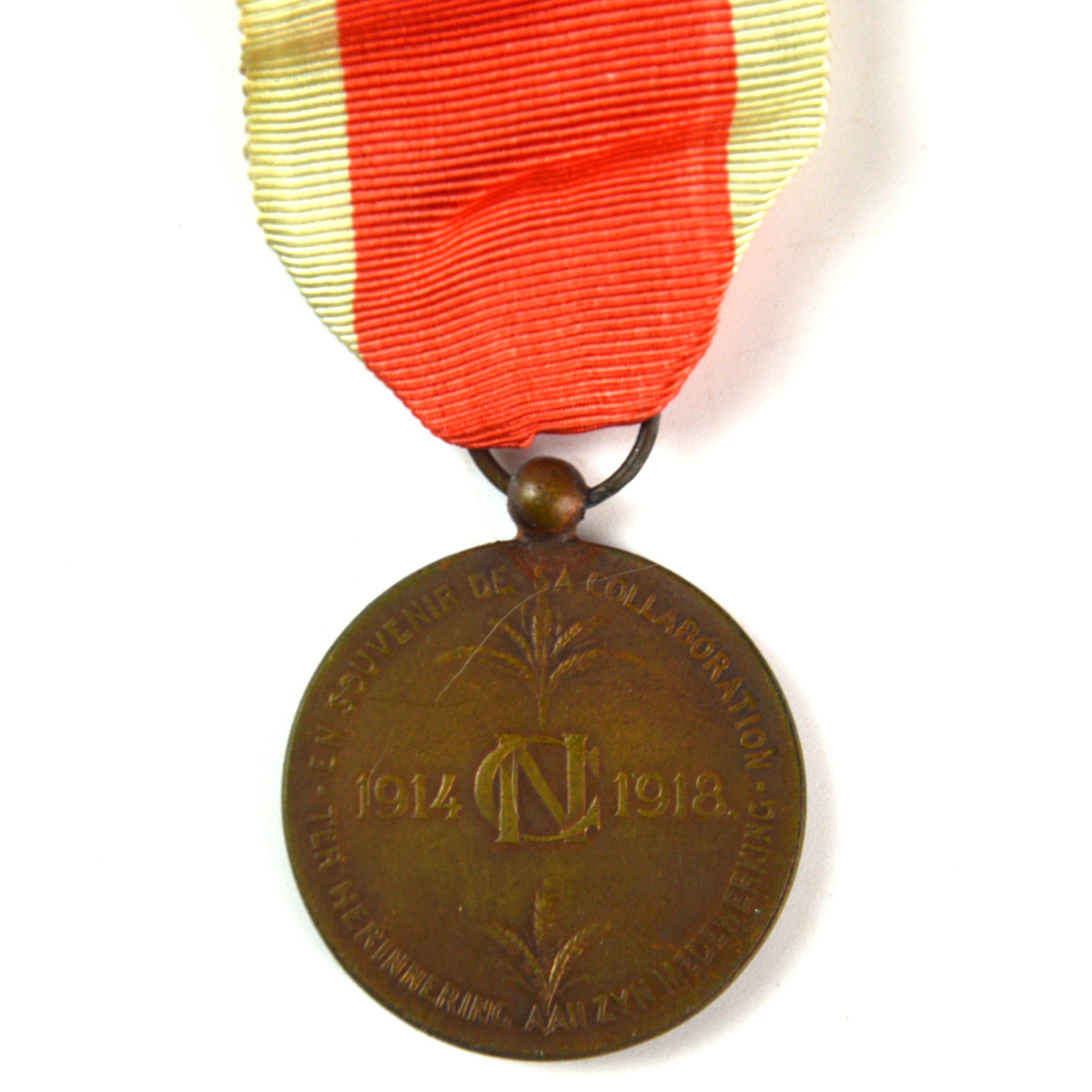Belgian Medal of the National Committee for Assistance and Food Supply (Medaille du Comite National de Secours et d’Alimentation), struck in bronze, representing the 4th Class of the medal. This humanitarian award was created during the First World War to recognise individuals and organisations who contributed to the relief and food supply efforts in occupied Belgium between 1914 and 1918. The circular bronze medal depicts a crowned female bust representing “la Belgique” within an oak wreath. The reverse features centrally the monogram of the National Committee ‘CN’ with the dates 1914 – 1918 to the left and right, above and below are representations of a cereal crop plant.