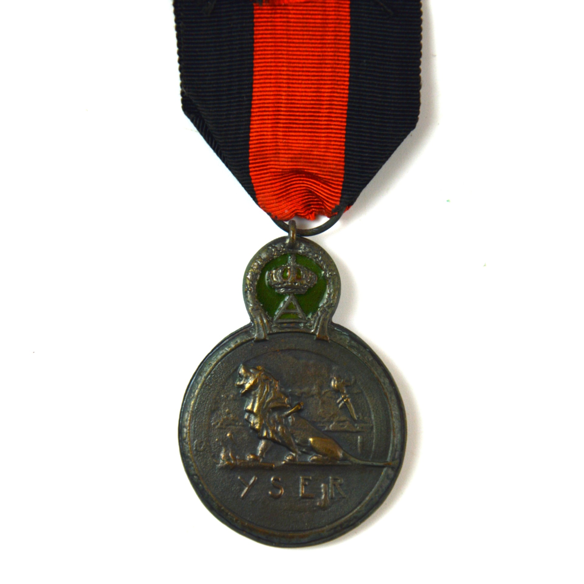 The obverse features the helmeted male figure of Victory, bearing a lance, symbolising Belgium’s steadfast resistance with the date “17-31 OCT 1914”, summounted with the relief inscription “YSER”. The reverse displays the relief image of the left side of a roaring wounded lion lying on the bank of the Yser river, with an arrow in its left shoulder, below the lion, the relief inscription “YSER”, in the medallion, the Belgian royal crown over the relief letter “A”, the monogram of King Albert. This example retains its correct bronze finish and is fitted with the original pattern ribbon in yellow with three central black stripes, representing both Belgium’s national colours and mourning for the fallen.