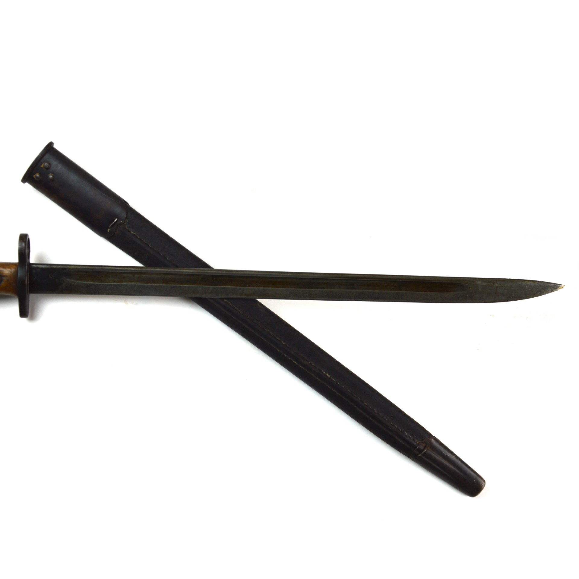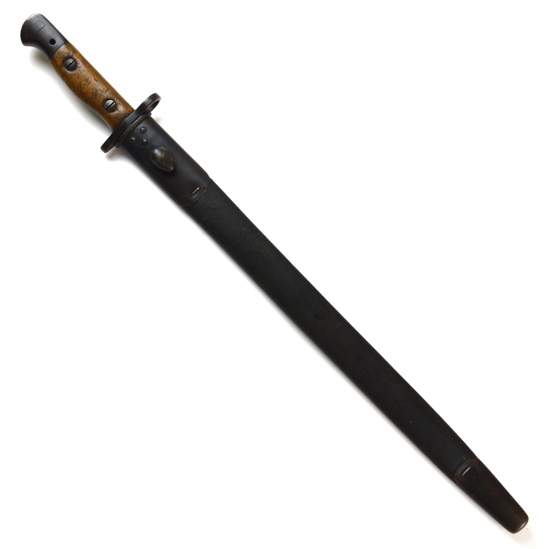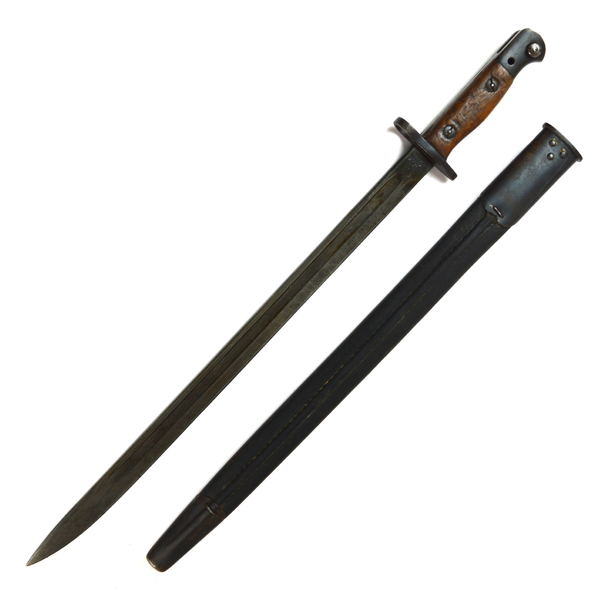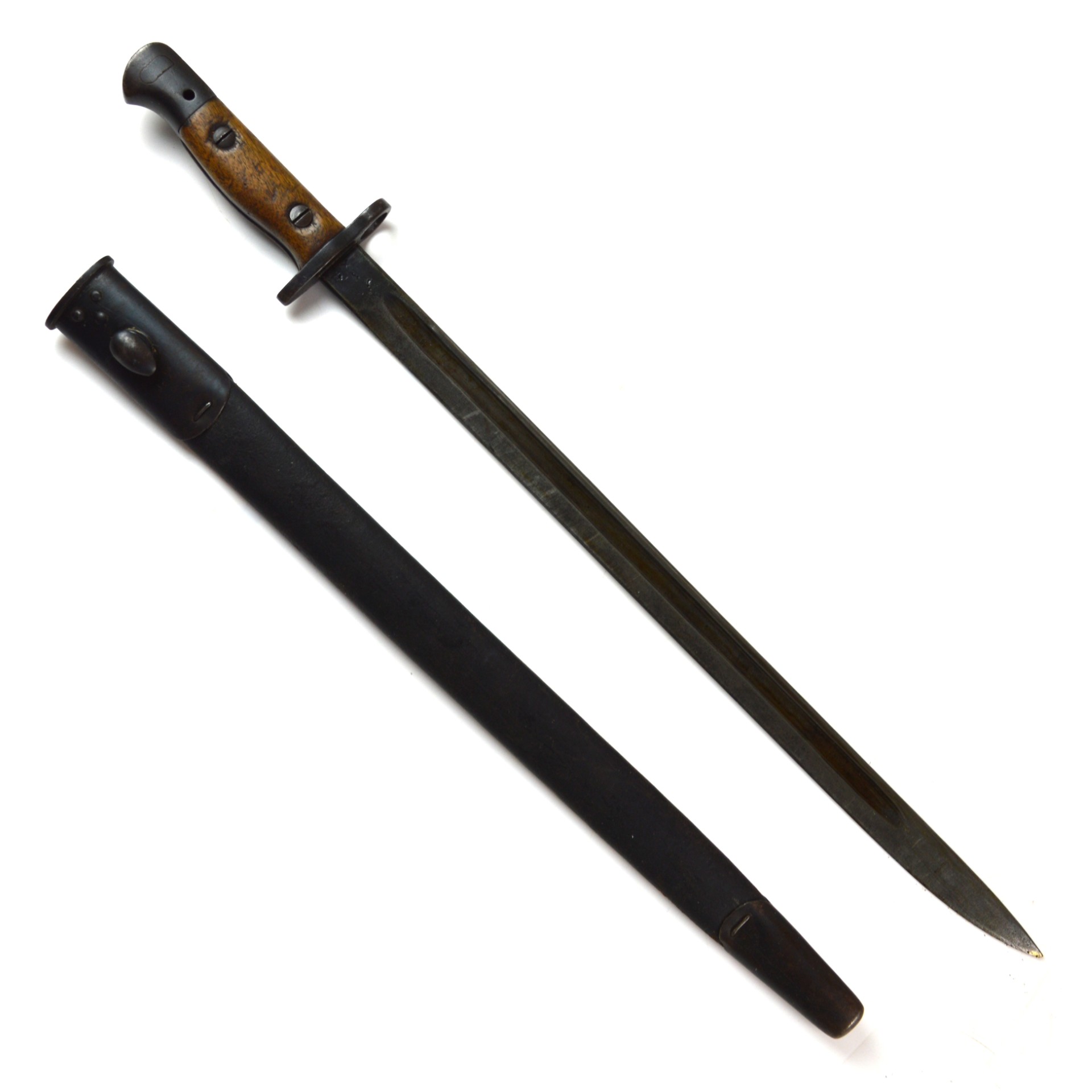 An original British 1907 Pattern bayonet manufactured by Wilkinson in November 1917. This pattern was the standard bayonet for the Short Magazine Lee-Enfield (SMLE) rifle throughout the First World War. Produced by several major makers, the Wilkinson Sword Company was one of the key wartime contractors, supplying high-quality equipment to the British Army. This example features a single-edged, fullered steel blade with a distinct point. The steel crossguard has a muzzle ring, and the pommel incorporates a working press-catch release. Fitted with original wooden grips secured by two bolts. Complete with its steel-mounted black leather scabbard