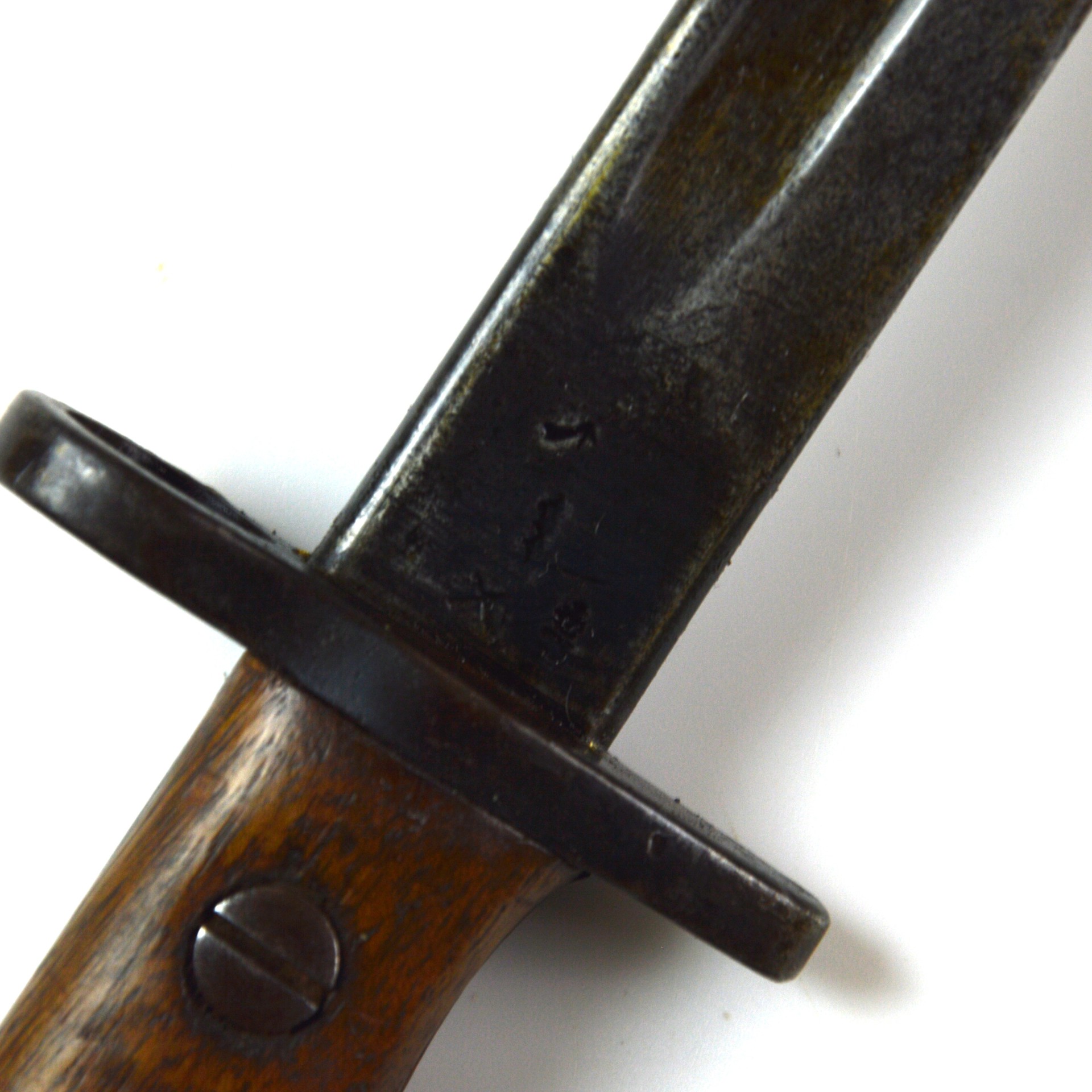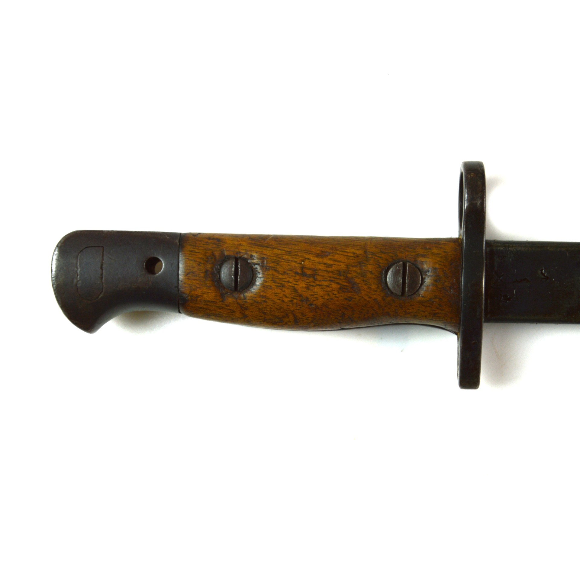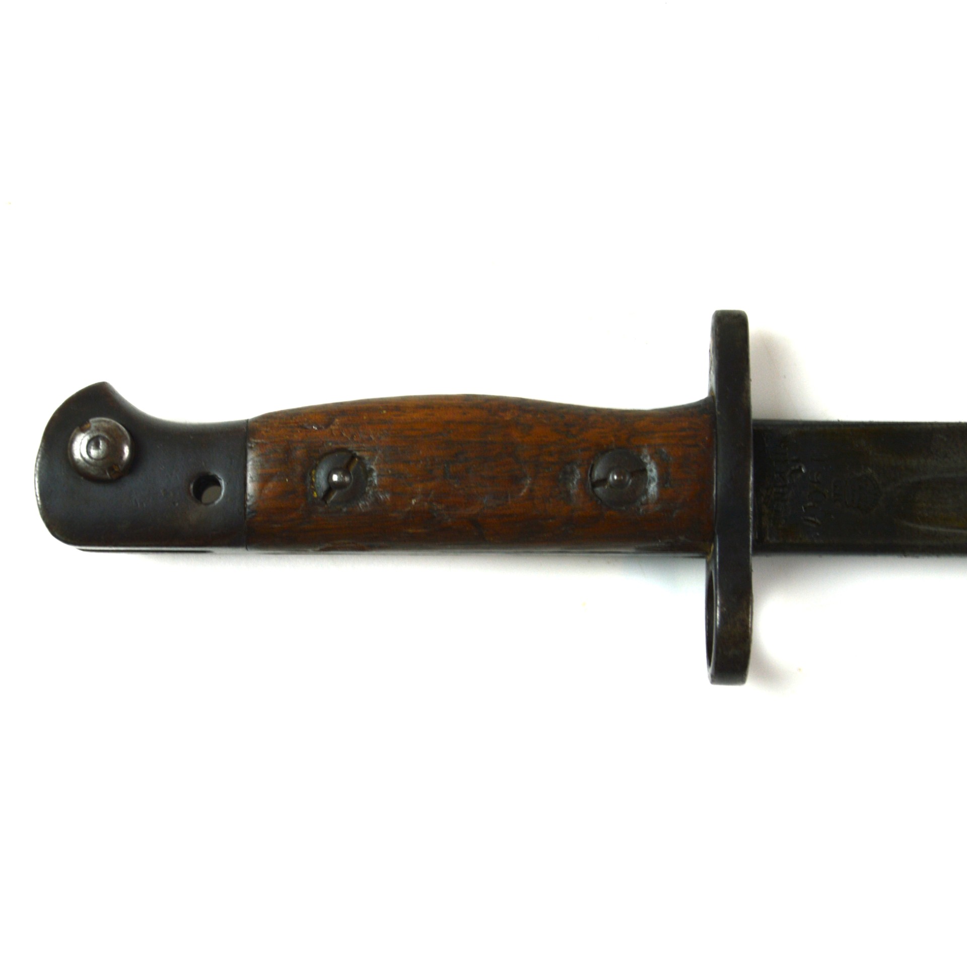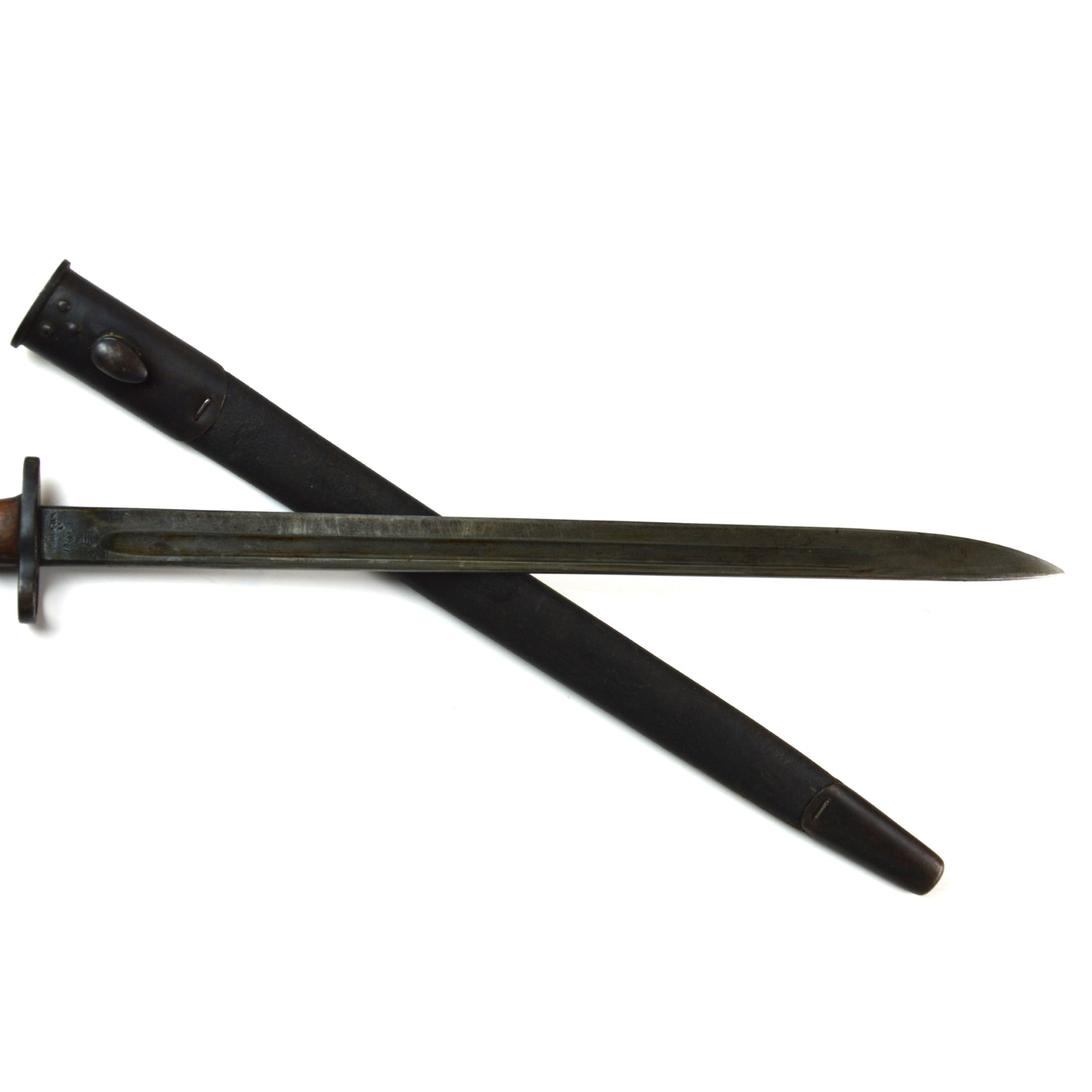 An original British 1907 Pattern bayonet manufactured by Wilkinson in November 1917. This pattern was the standard bayonet for the Short Magazine Lee-Enfield (SMLE) rifle throughout the First World War. Produced by several major makers, the Wilkinson Sword Company was one of the key wartime contractors, supplying high-quality equipment to the British Army. This example features a single-edged, fullered steel blade with a distinct point. The steel crossguard has a muzzle ring, and the pommel incorporates a working press-catch release. Fitted with original wooden grips secured by two bolts. Complete with its steel-mounted black leather scabbard