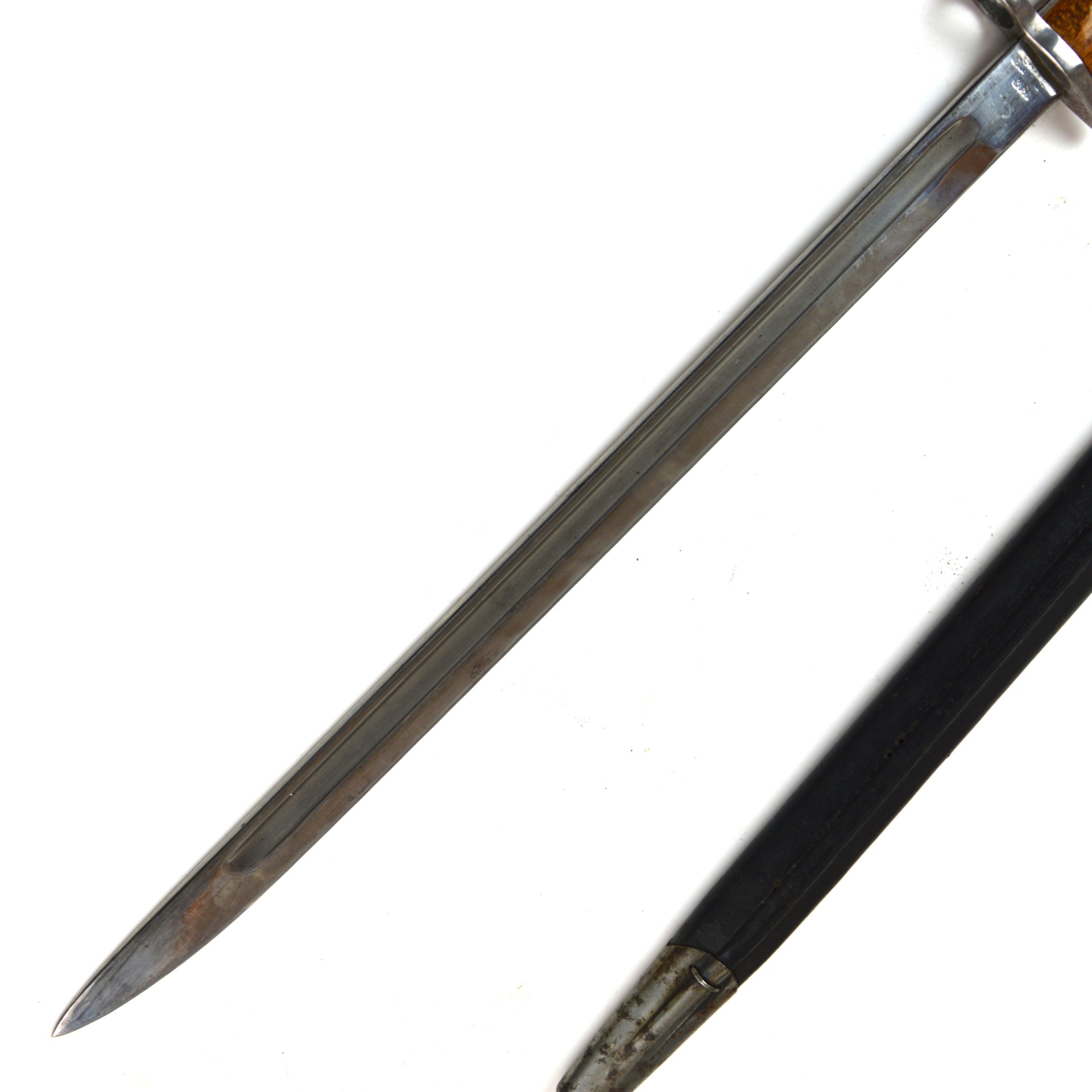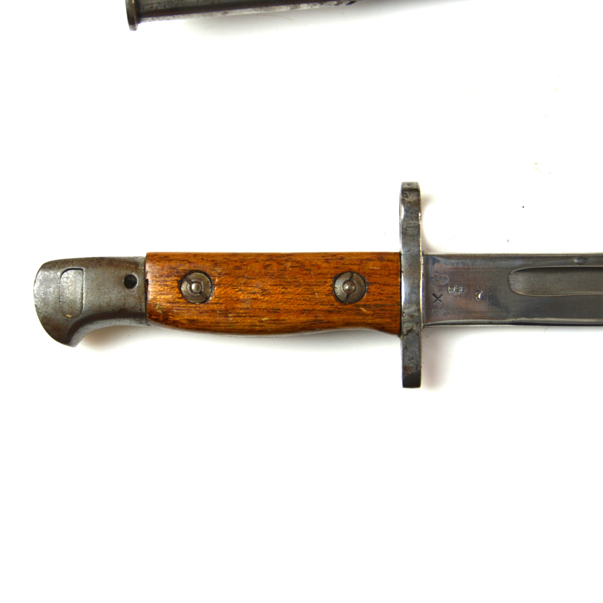 The bayonet has a straight, fullered blade with a single edge; the cross guard has an integral muzzle ring for fitting onto the Lee-Enfield SMLE, as well as a locking catch on the pommel. The hilt is fitted with slab grips with 2 nuts and bolts. Comes with its leather scabbard with chrome-plated steel mounts.