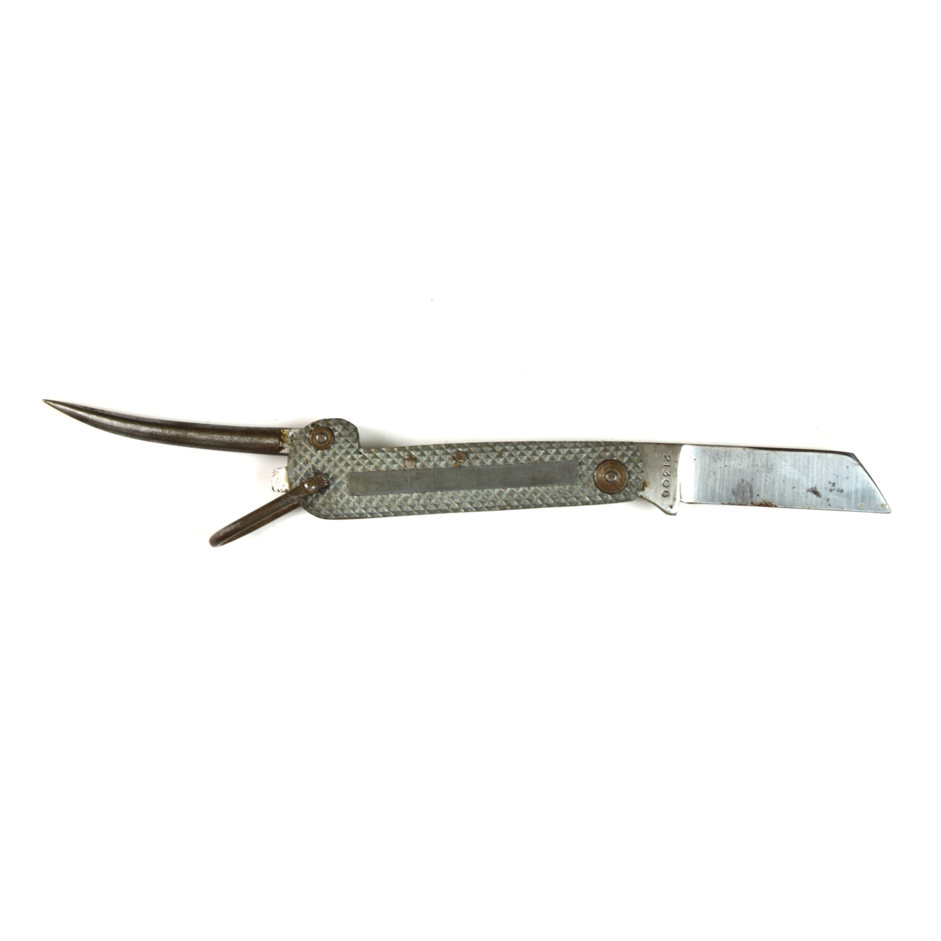 An original British Admiralty pattern pocket jack knife, maker marked “Rodgers, Sheffield, England” and model number “21306”. A typical multi-tool pocket jack intended for naval and seafaring use, this example features a stout blade and a marlin spike housed in a single compact folding frame with aluminium scales. The knife is a practical, robust and typical of Admiralty-issued personal kit for ratings and petty officers.