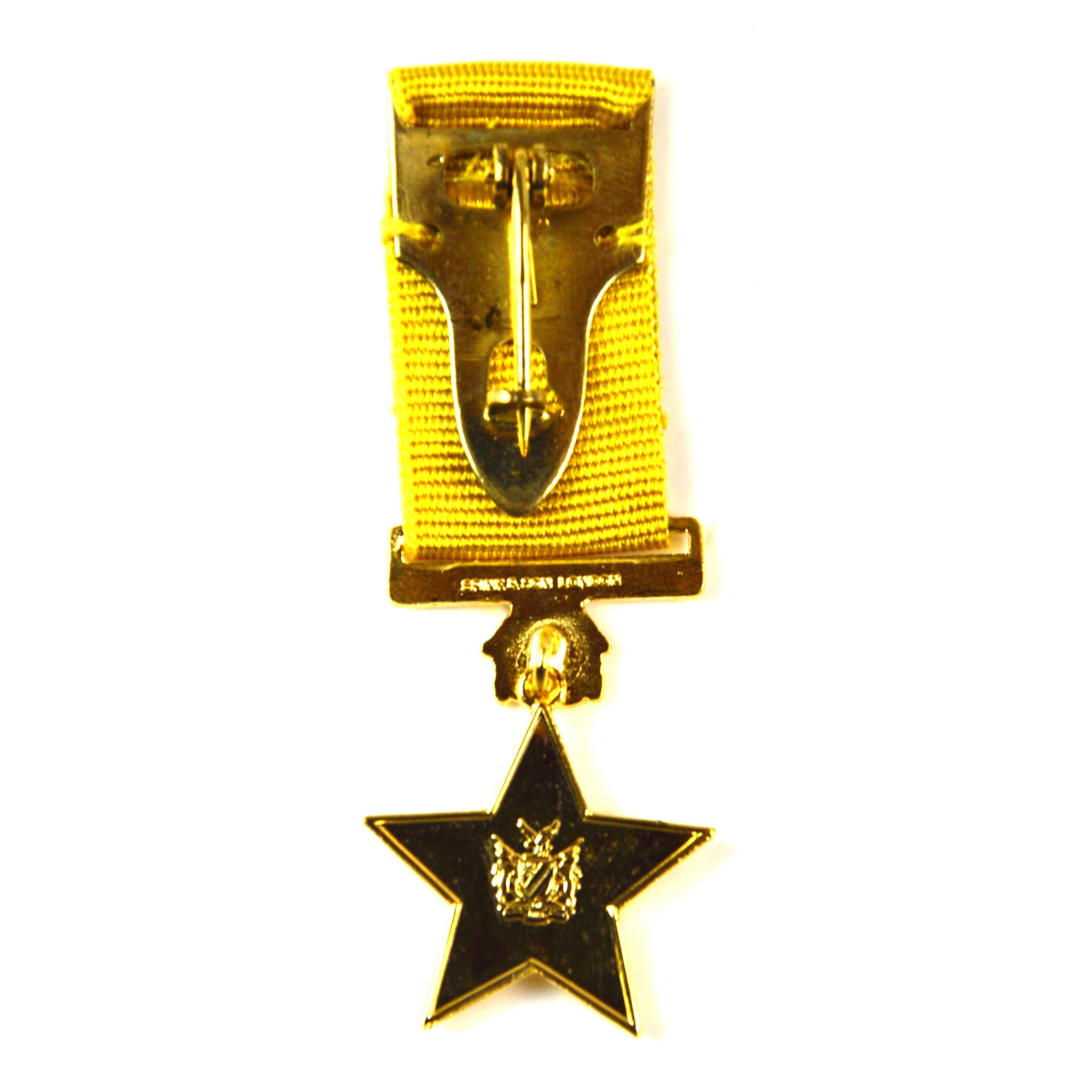 Namibian Defence Force Campaign Medal, Miniature. The medal features a gilt 5-pointed star with a central device, an ornate bar suspender, and a golden yellow ribbon mounted with a brooch for wear.