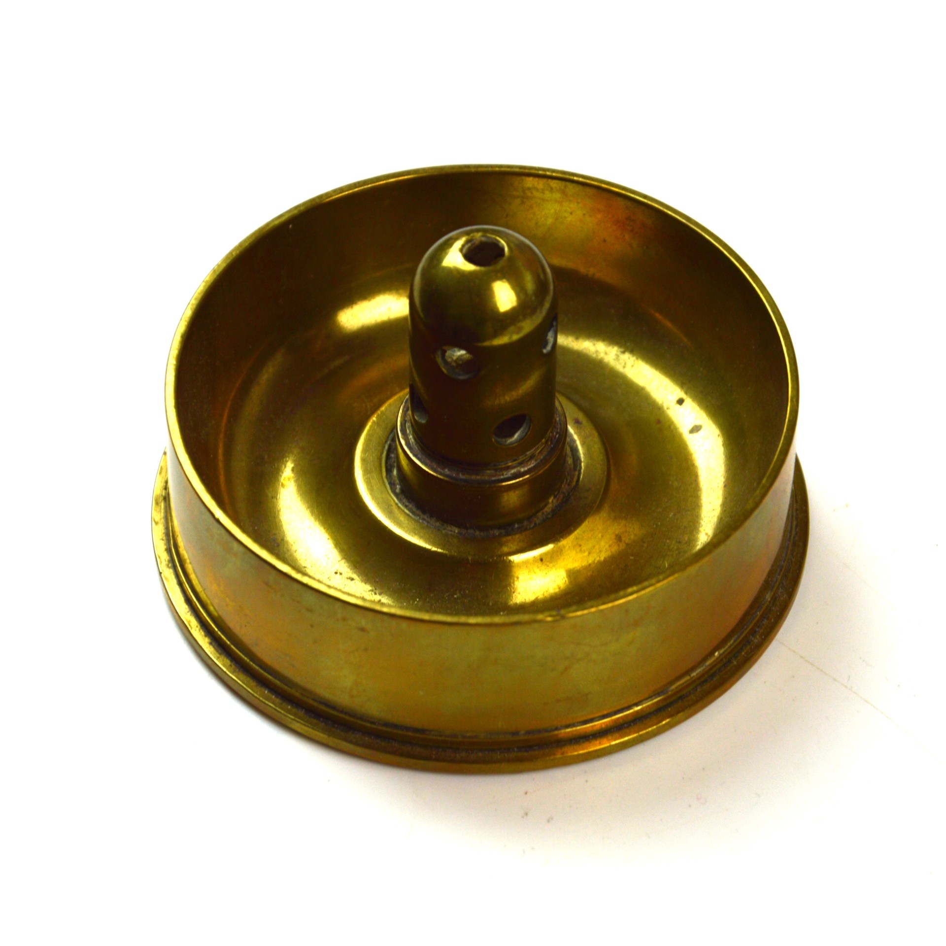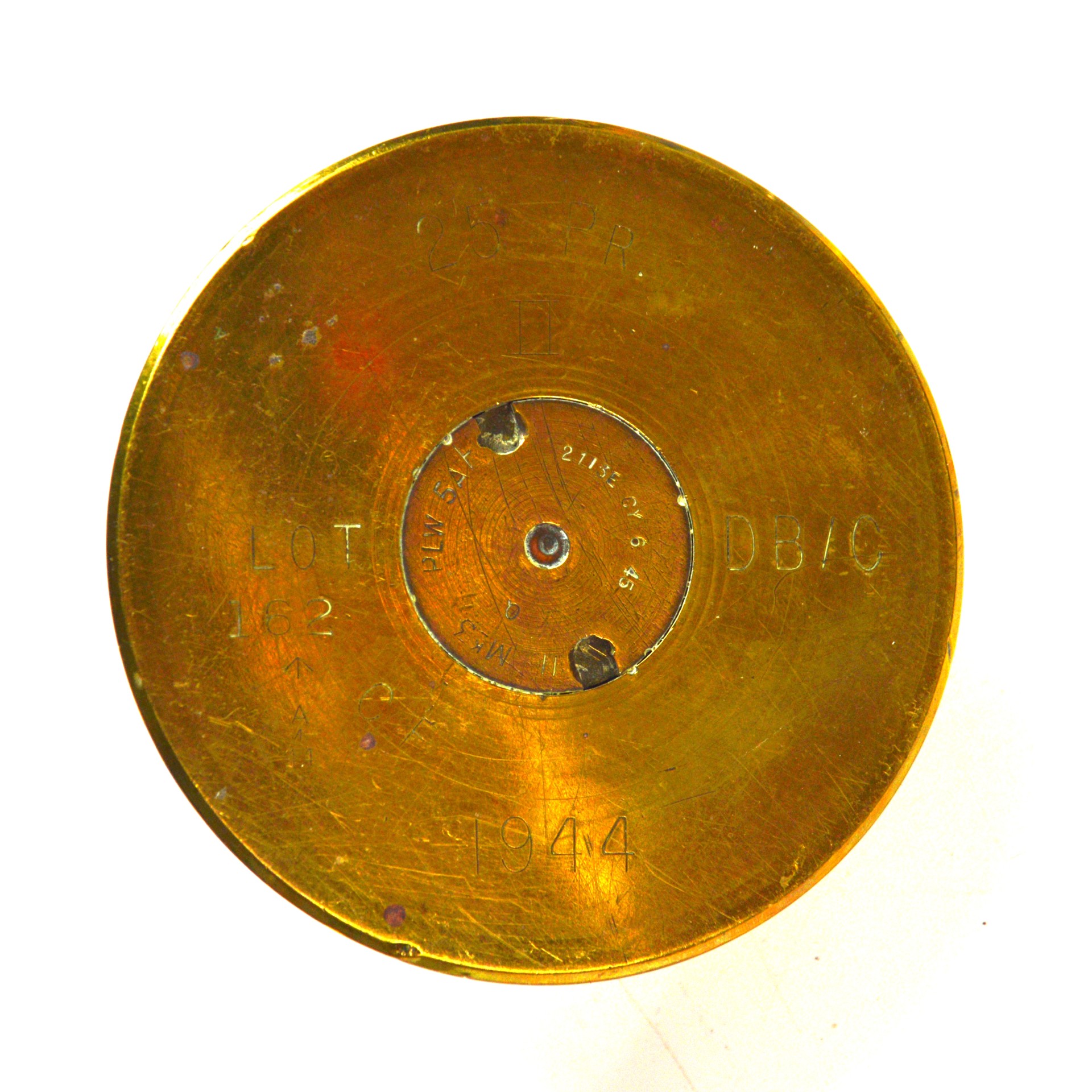 An example of WW2 trench art, this piece repurposes an original Canadian-made 25-Pounder Mk. II brass shell case, dated 1944, into an ashtray or paperweight. The QF 25-pounder was a common field gun of the British Army throughout the Second World War