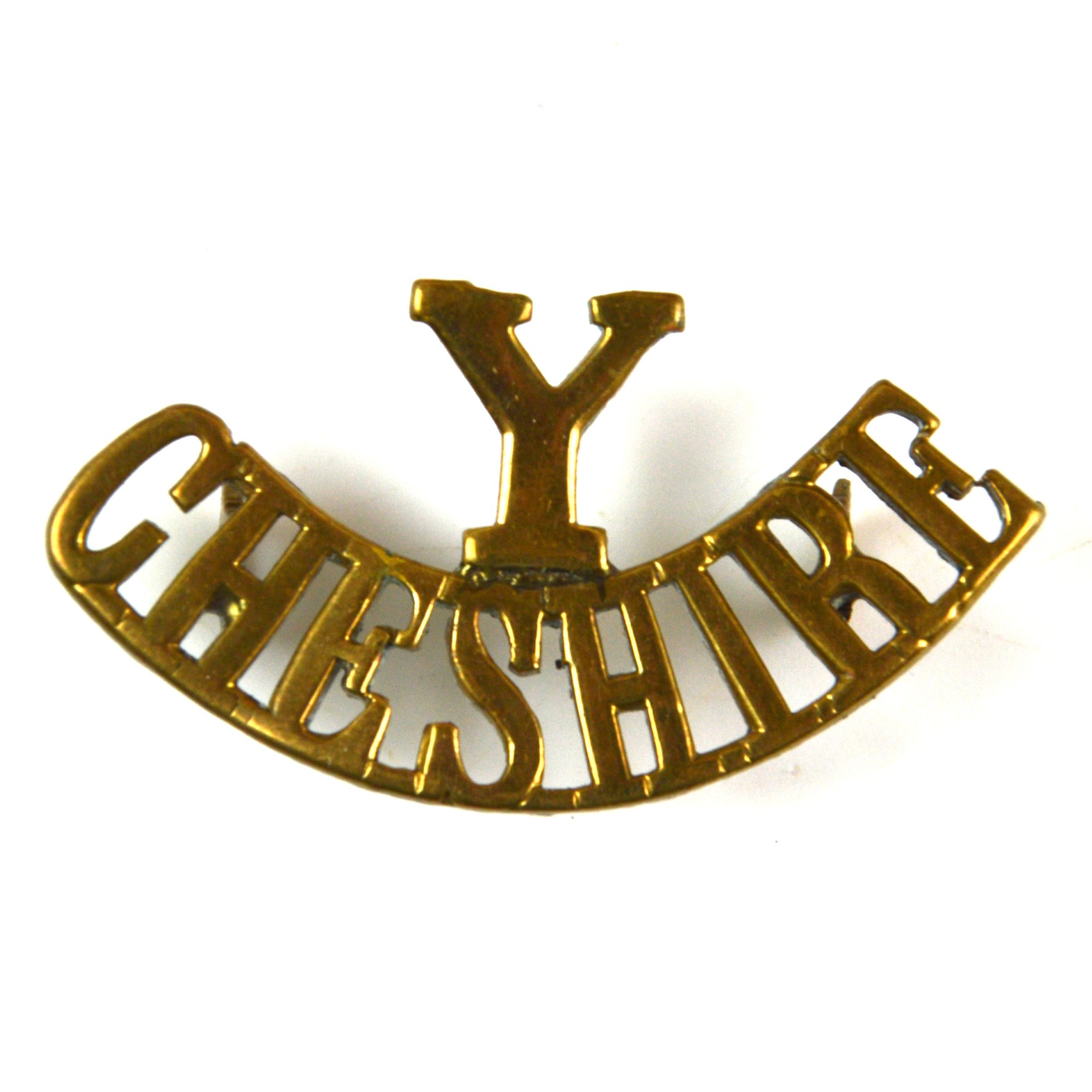 The die-stamped brass shoulder title follows the standard yeomanry two-line design, reading “Y / CHESHIRE”, produced with integral brass loops to the reverse for secure attachment to the shoulder strap of the service tunic or battledress.