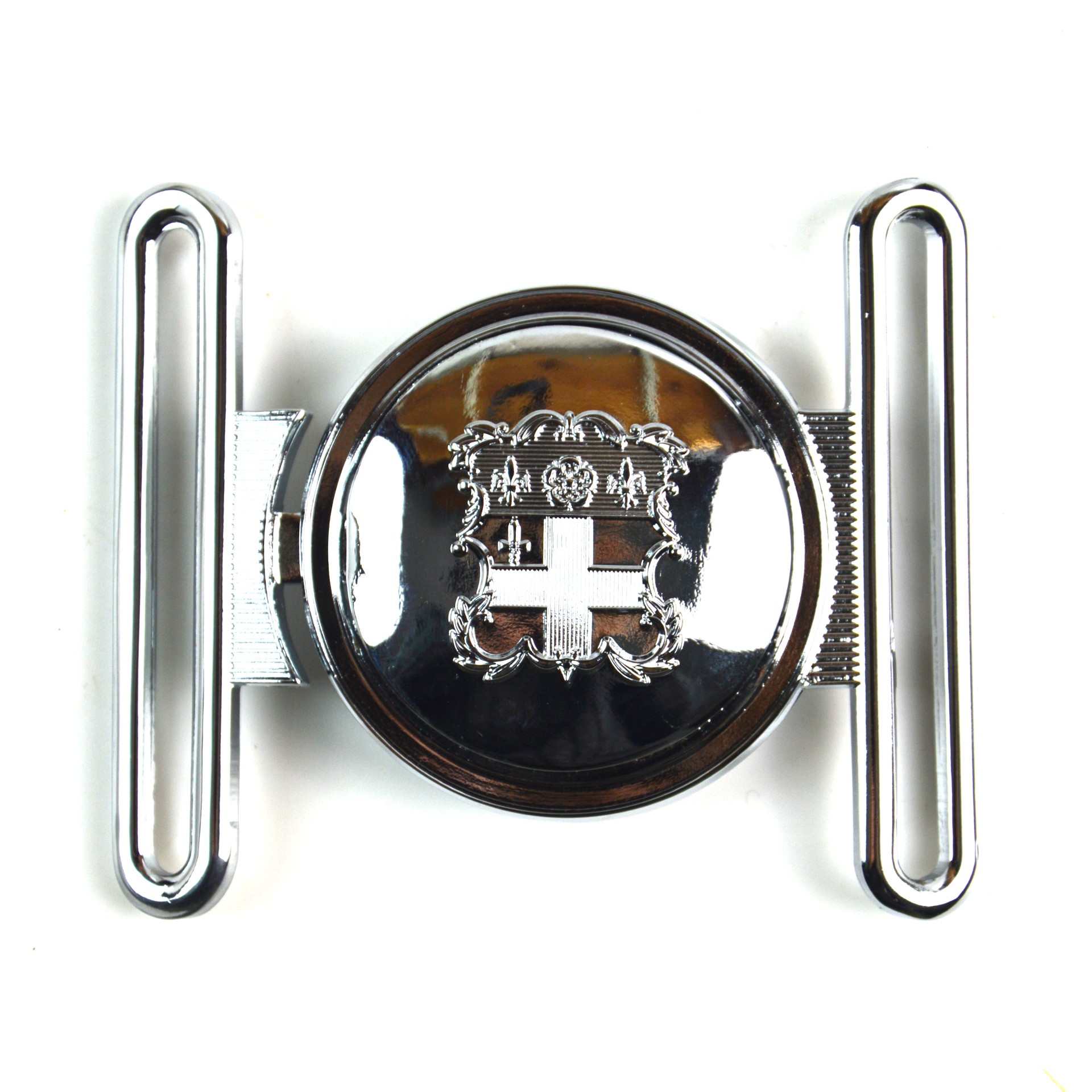 Christ’s Hospital School Combined Cadet Force belt buckle, produced for wear as part of the school’s CCF uniform. This British cadet force buckle is manufactured in chromed metal and displays the Christ’s Hospital School insignia in relief, arranged in a formal and symmetrical design consistent with Combined Cadet Force accoutrements. Intended for wear on the stable belt, it reflects the traditional style and construction associated with school and cadet force uniform equipment in the United Kingdom.