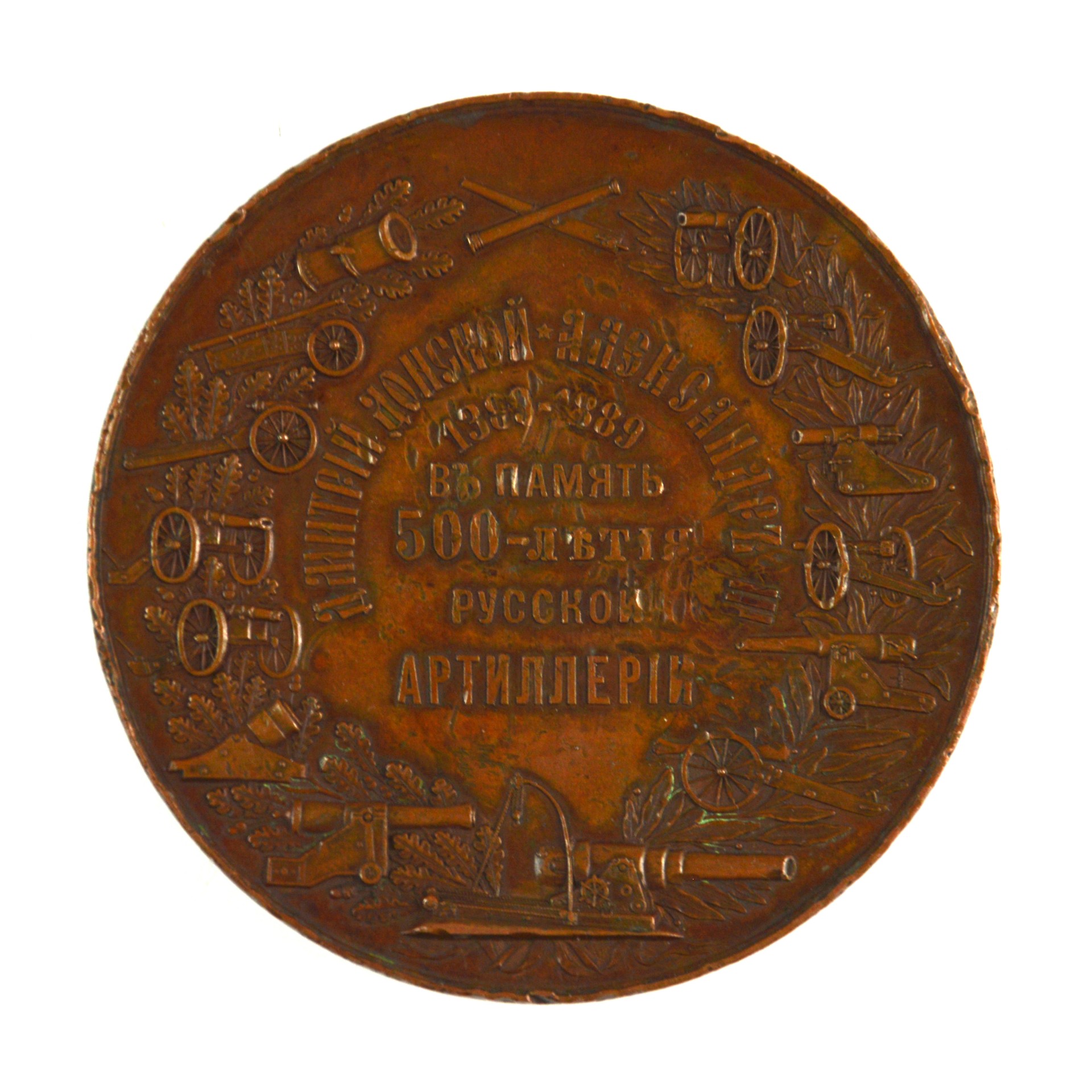 Medallion commemorating the 500th Anniversary of Russian Artillery, issued in 1889 to mark five centuries since the establishment of artillery forces in Russia. This Imperial Russian commemorative medal reflects the late 19th-century tradition of producing official and semi-official medallions to celebrate significant military anniversaries.