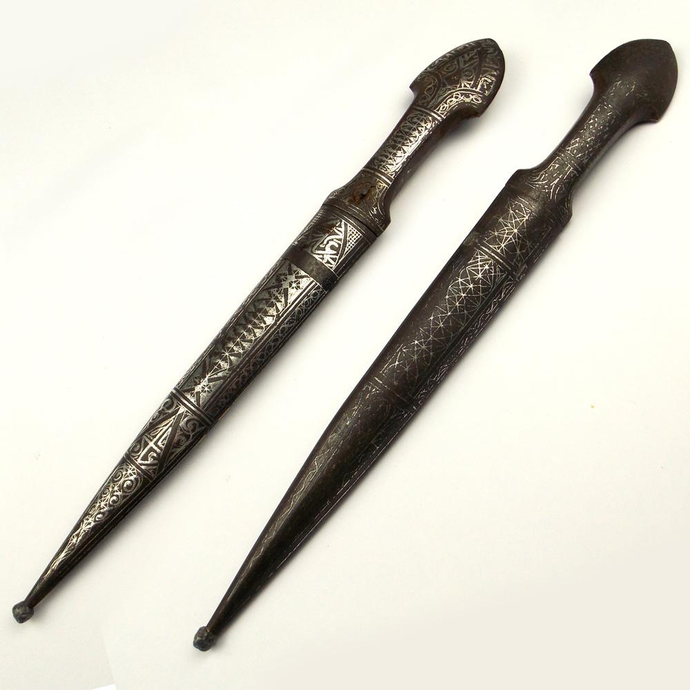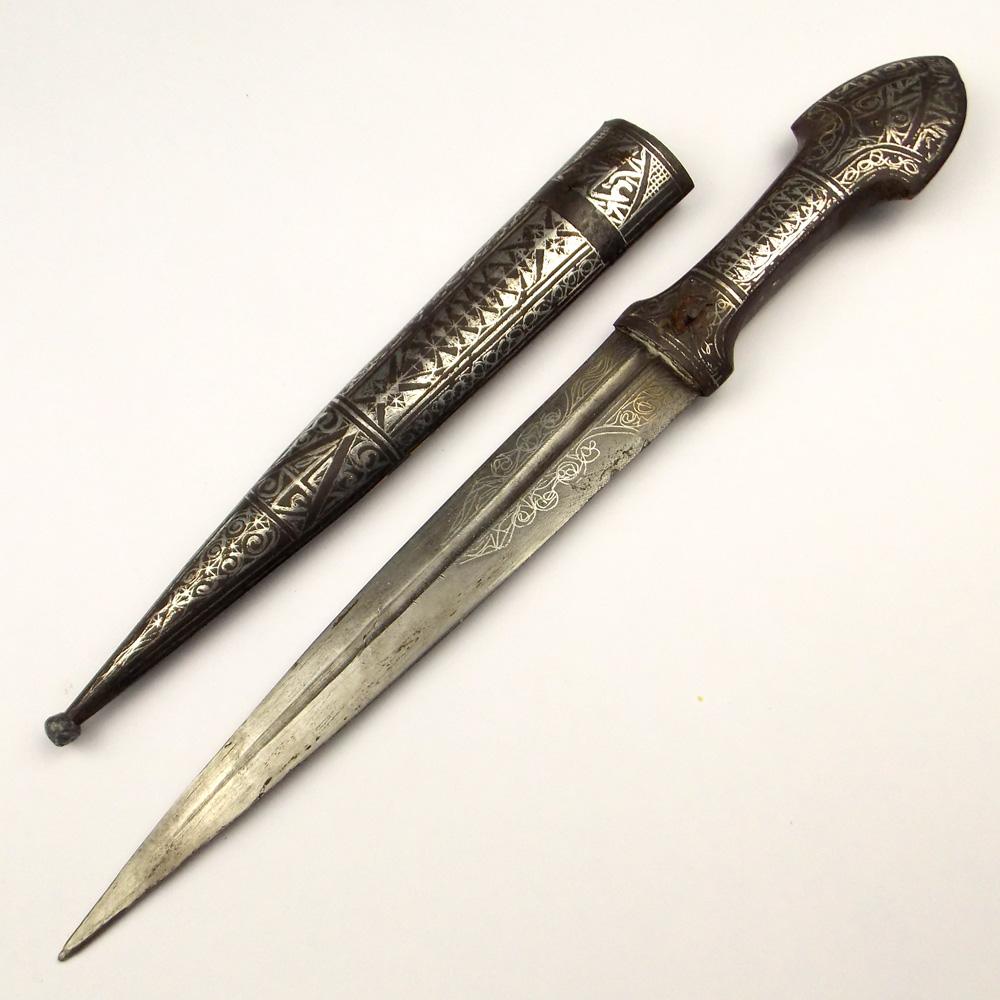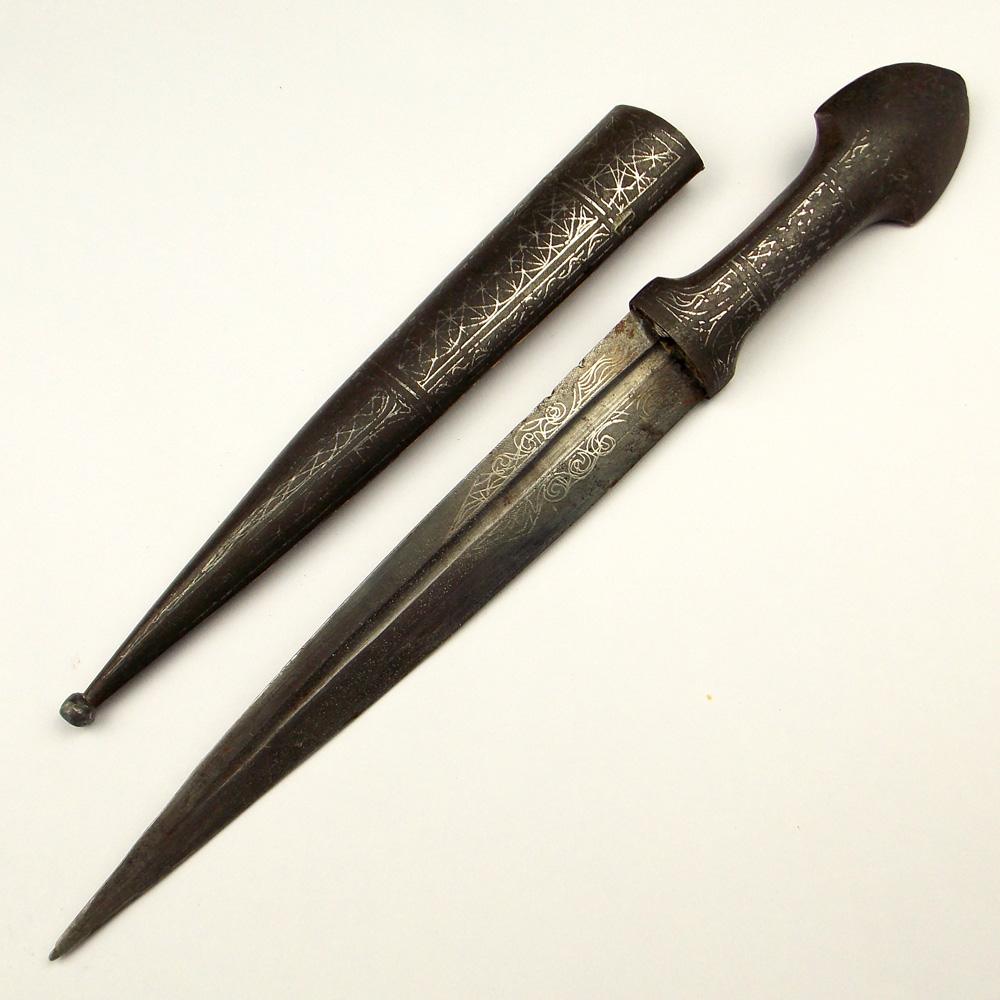 Indo-Persian Kinjal Dagger silver koftari decorated hilt and scabbard