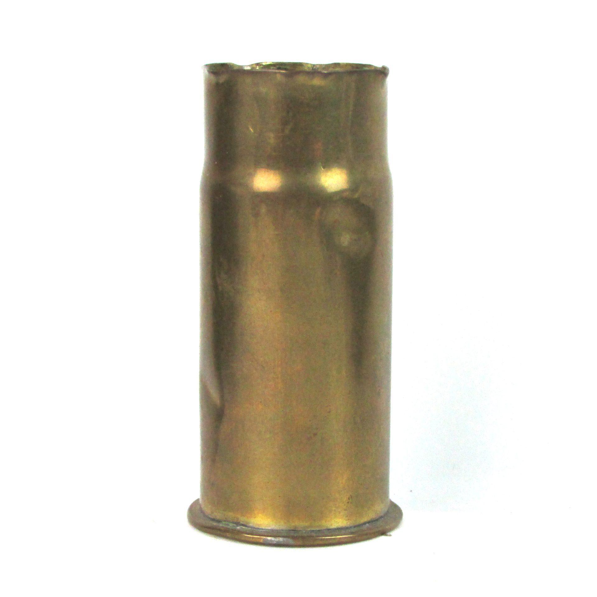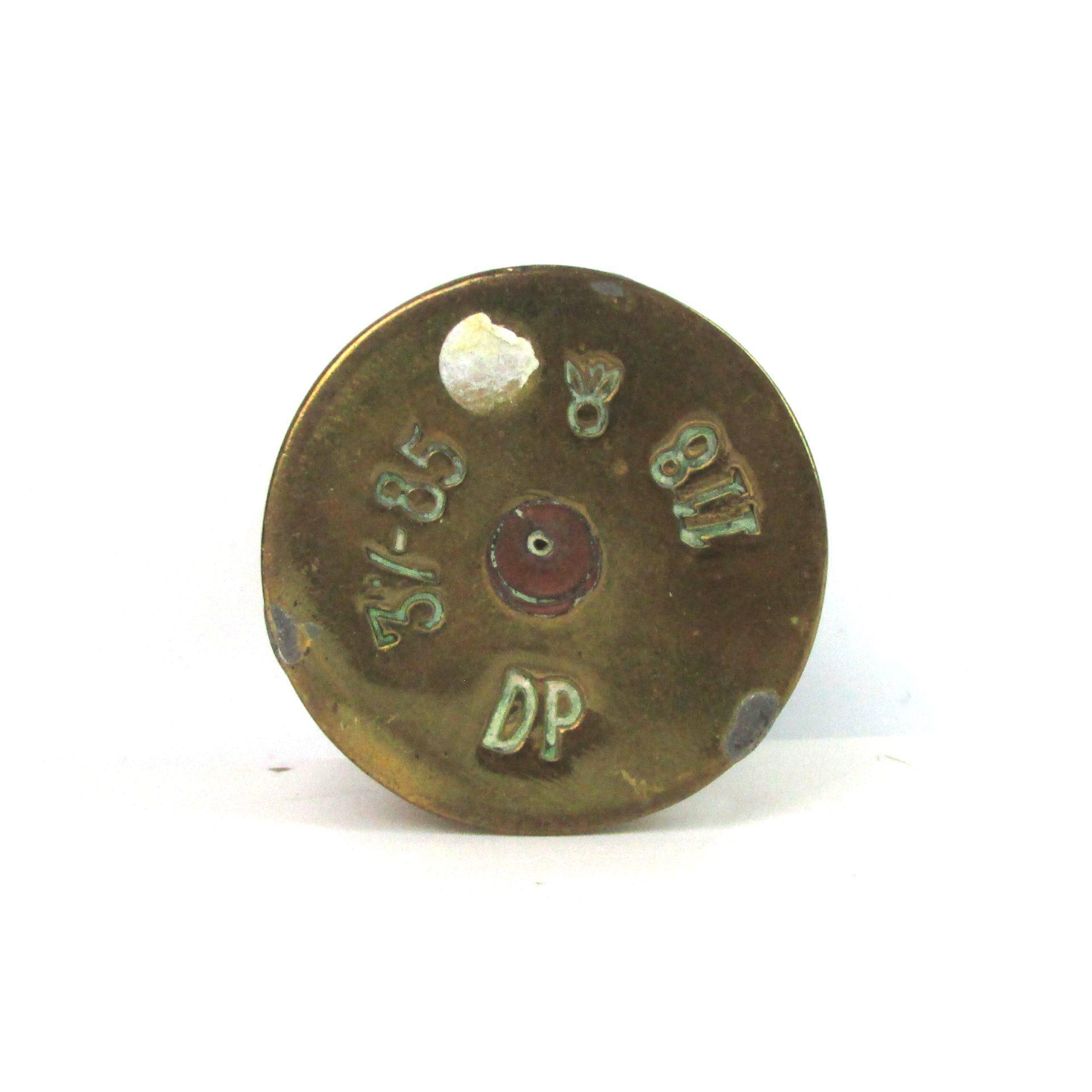 French 37mm 1pdr Inert Trench Art Shell Case with “Ypres” badge on the front. Base marked “37-85” and “DP, 118” and a flaming grenade.