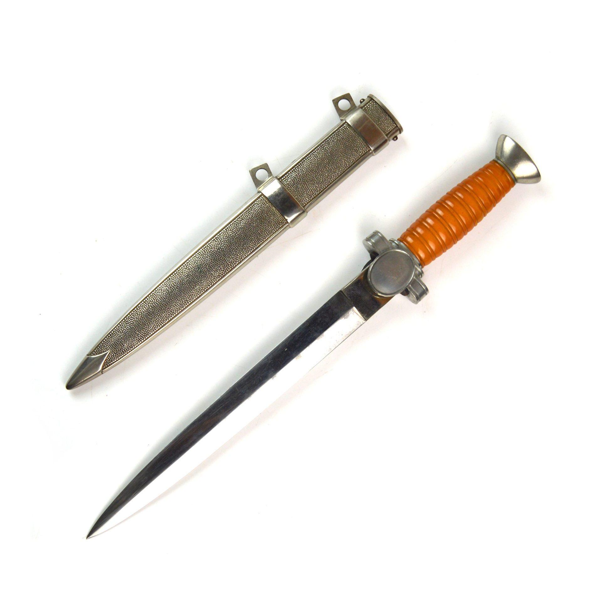 German Third Reich Red Cross (Deutsches Rotes Kreuz or DRK) Leader’s Dagger. Red Cross Officer’s Dagger with the scarce orange cellulose grip, nickel-plated mounts, zinc pommel and nickel-plated scabbard. 247mm polished double-edged blade, with no maker’s name. 384mm OAL