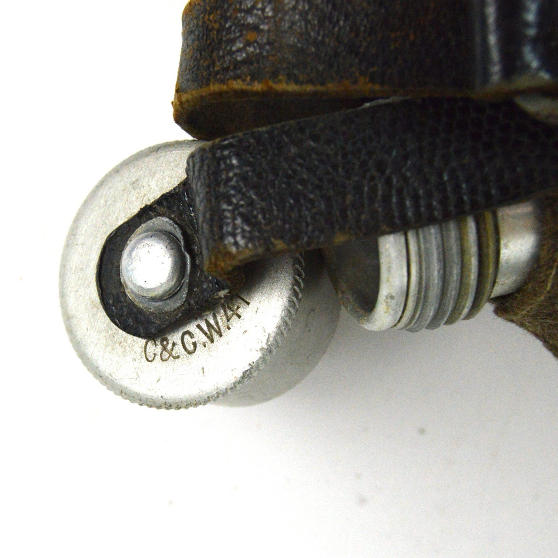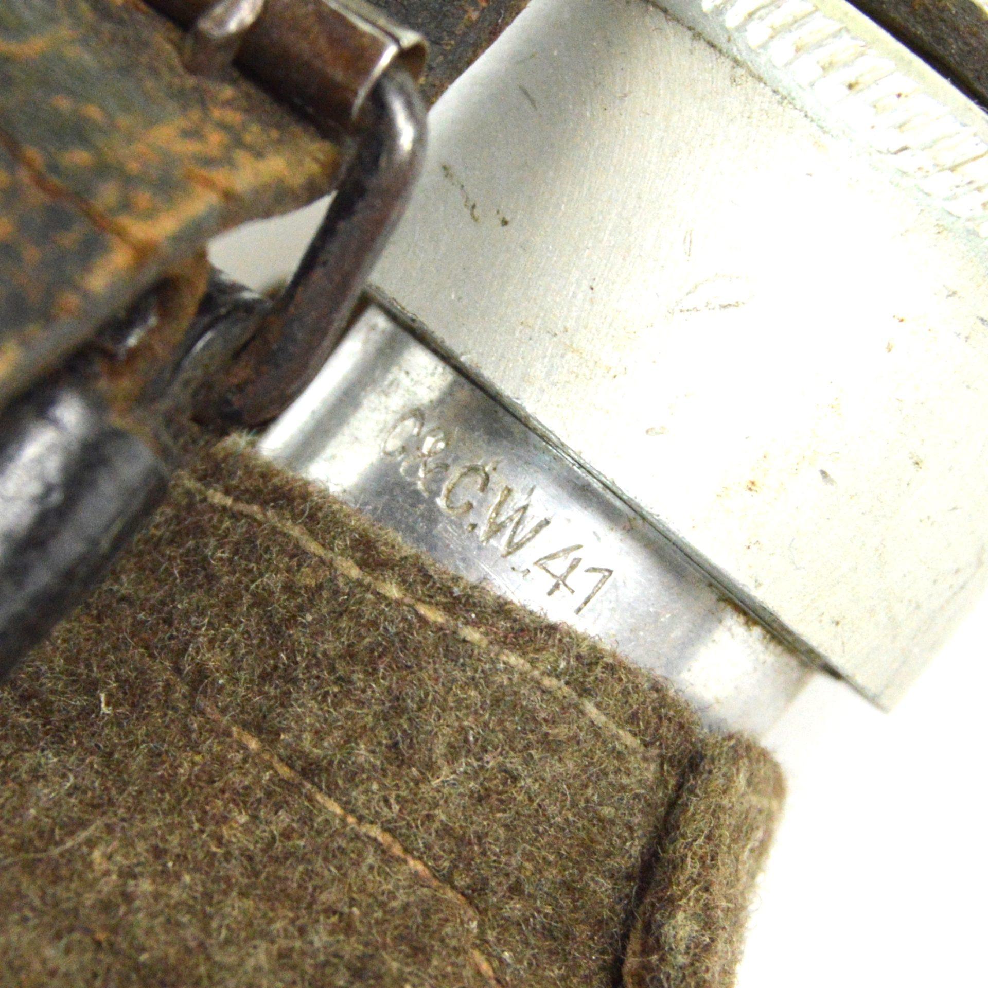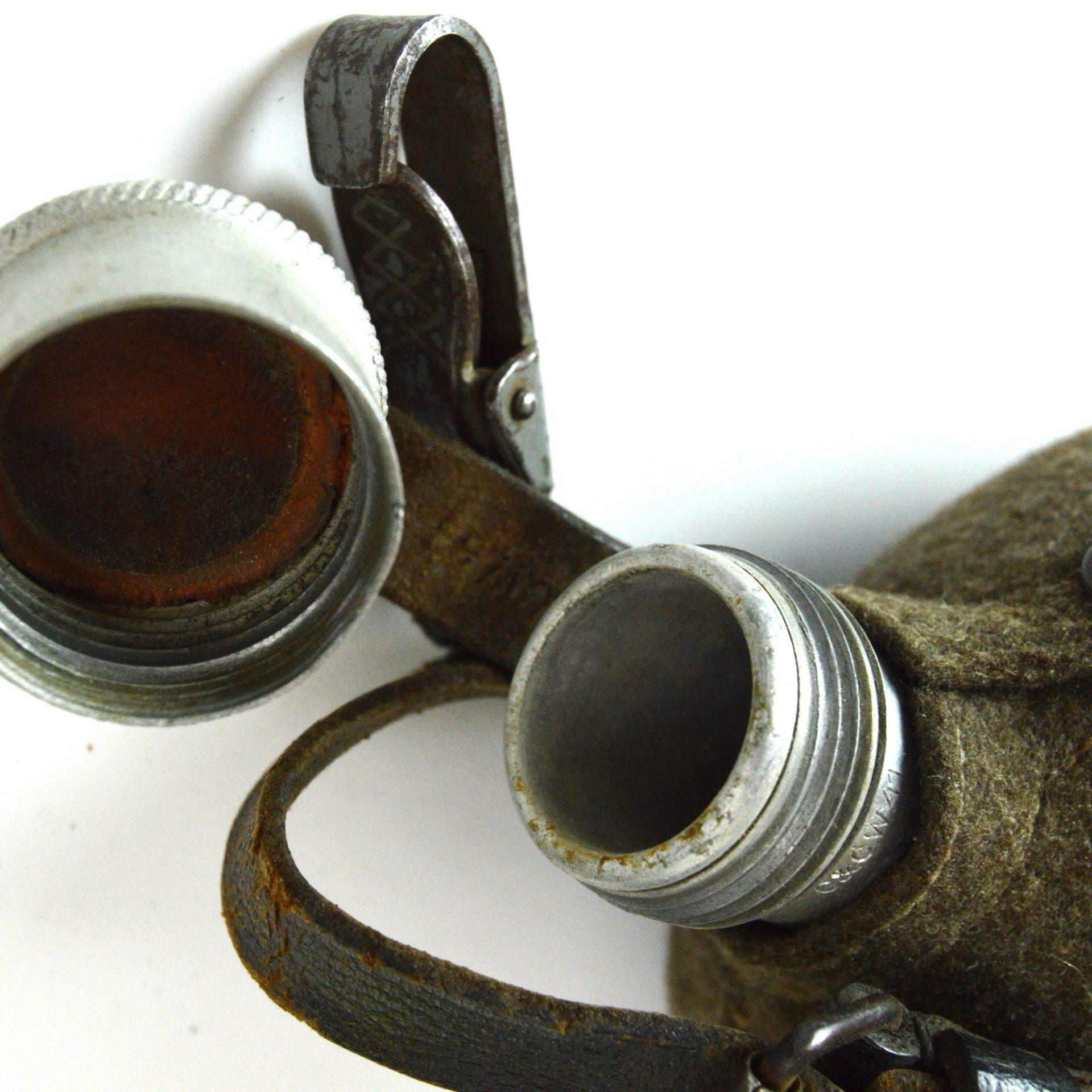 German WWII Canteen, complete in tropical felt, marked “C & CW 41” on the rim, cap and leather strap.