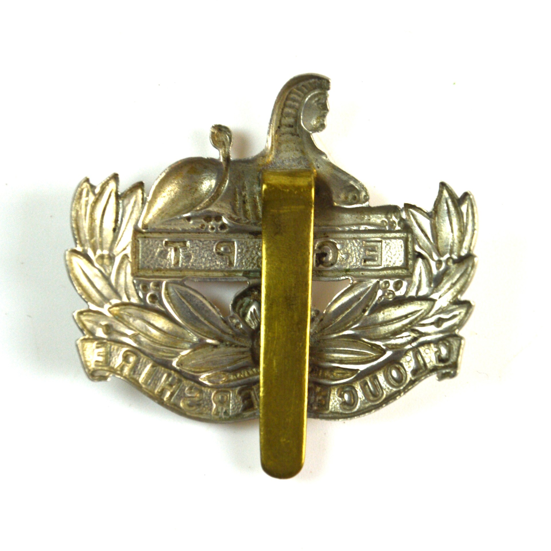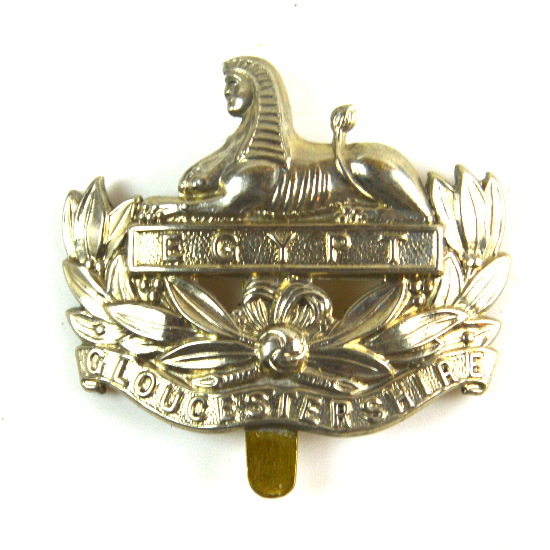 An original cap badge of the Gloucestershire Regiment, manufactured in white metal and fitted with a hook slider fastening. This British Army cap badge displays the regiment’s recognised insignia of the Sphinx and battle honour “Egypt” above a wreath and the regimental county “Gloucestershire” in clear relief. The use of white metal is characteristic of early to mid-20th-century production, and the hook slider fixing for wear on the service dress headdress.