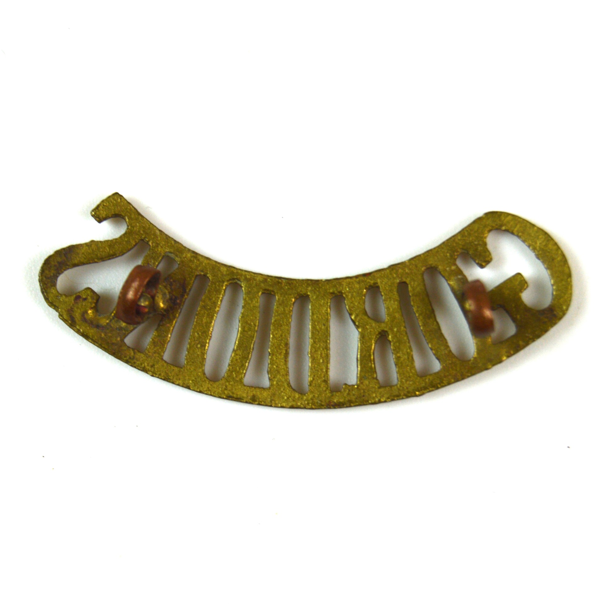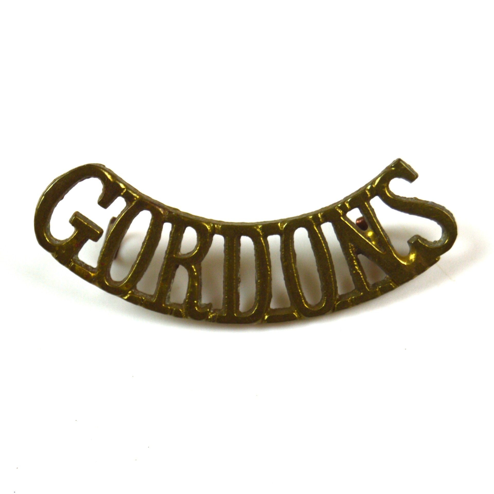 Gordon Highlanders brass shoulder title, of the 1922–c.1960s Pattern, worn on the service dress and battledress uniforms of this distinguished Scottish infantry regiment. The Gordon Highlanders served with distinction throughout the interwar years, the Second World War, and into the early Cold War period, before amalgamating into The Highlanders (Seaforth, Gordons and Camerons) in 1994.