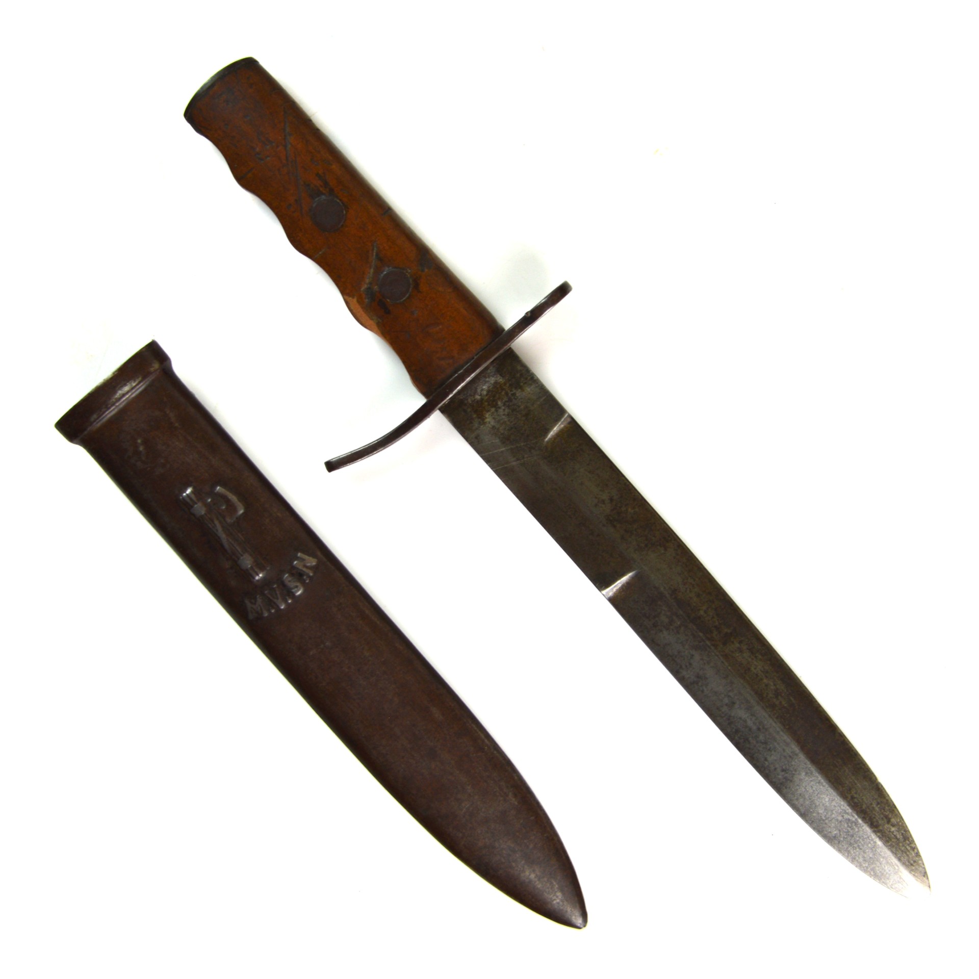 The dagger features a single, false-edged steel blade, a slightly formed crossguard, and a ribbed wooden grip secured by brass rivets, terminating in a slightly rounded pommel. The scabbard is constructed of painted black steel with the “MVSN” initials below the fasces. This design was based on earlier Italian combat knives and daggers, standardised for the Fascist militia during the interwar and Second World War periods.