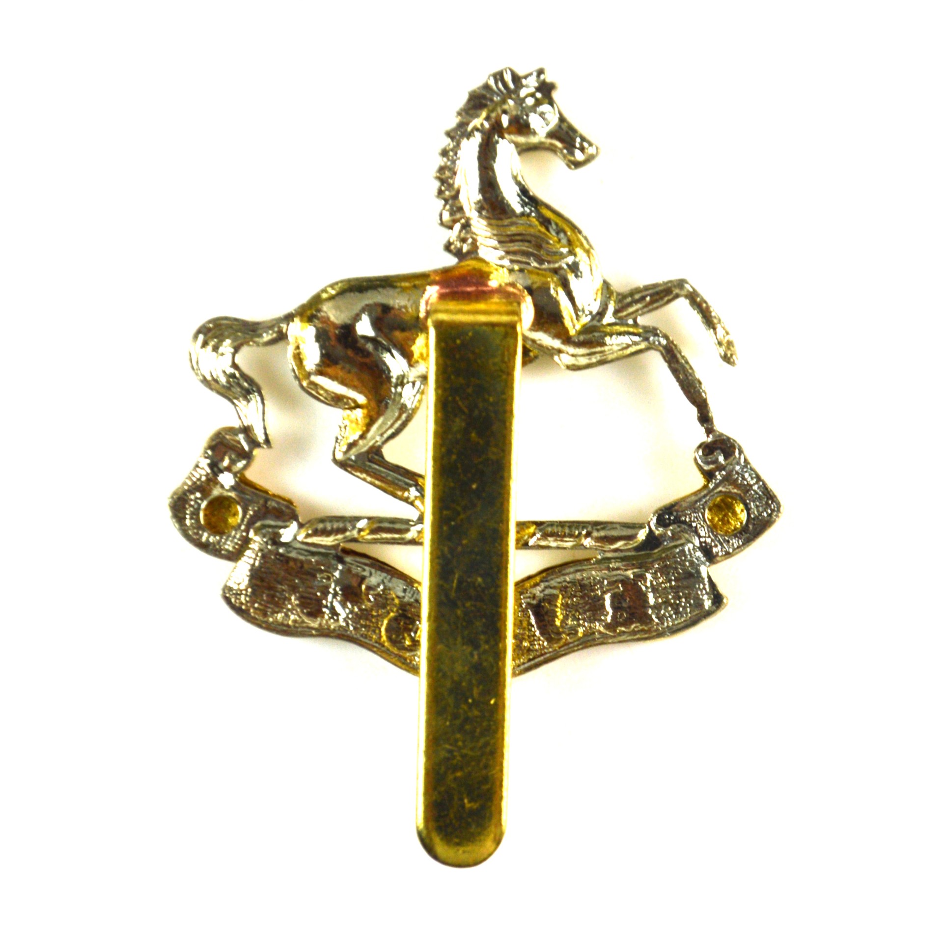 King’s Regiment (Liverpool) beret cap badge produced as a restrike of the pattern worn between 1927 and 1958 by the King’s Regiment (Liverpool) of the British Army. This British Army infantry beret badge displays the recognised insignia of the regiment in clear relief, incorporating the White Horse of Hanover with the scroll bearing the title “King’s”, arranged in a formal composition typical of mid-twentieth-century British Army infantry headdress insignia.