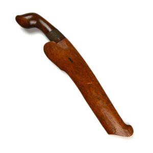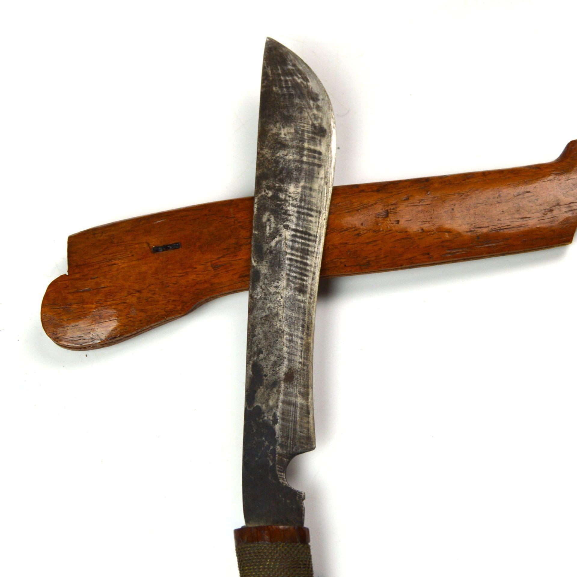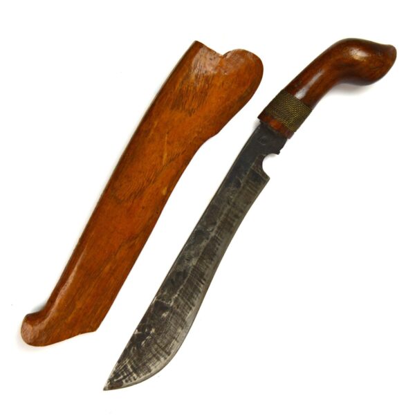 Malaysian Parang in Scabbard. 690mm single-edged blade with a large notch toward the base, on a hardwood and brass bound handle, kept within a hardwood scabbard. Seemingly marked on the ricasso, however unclear.