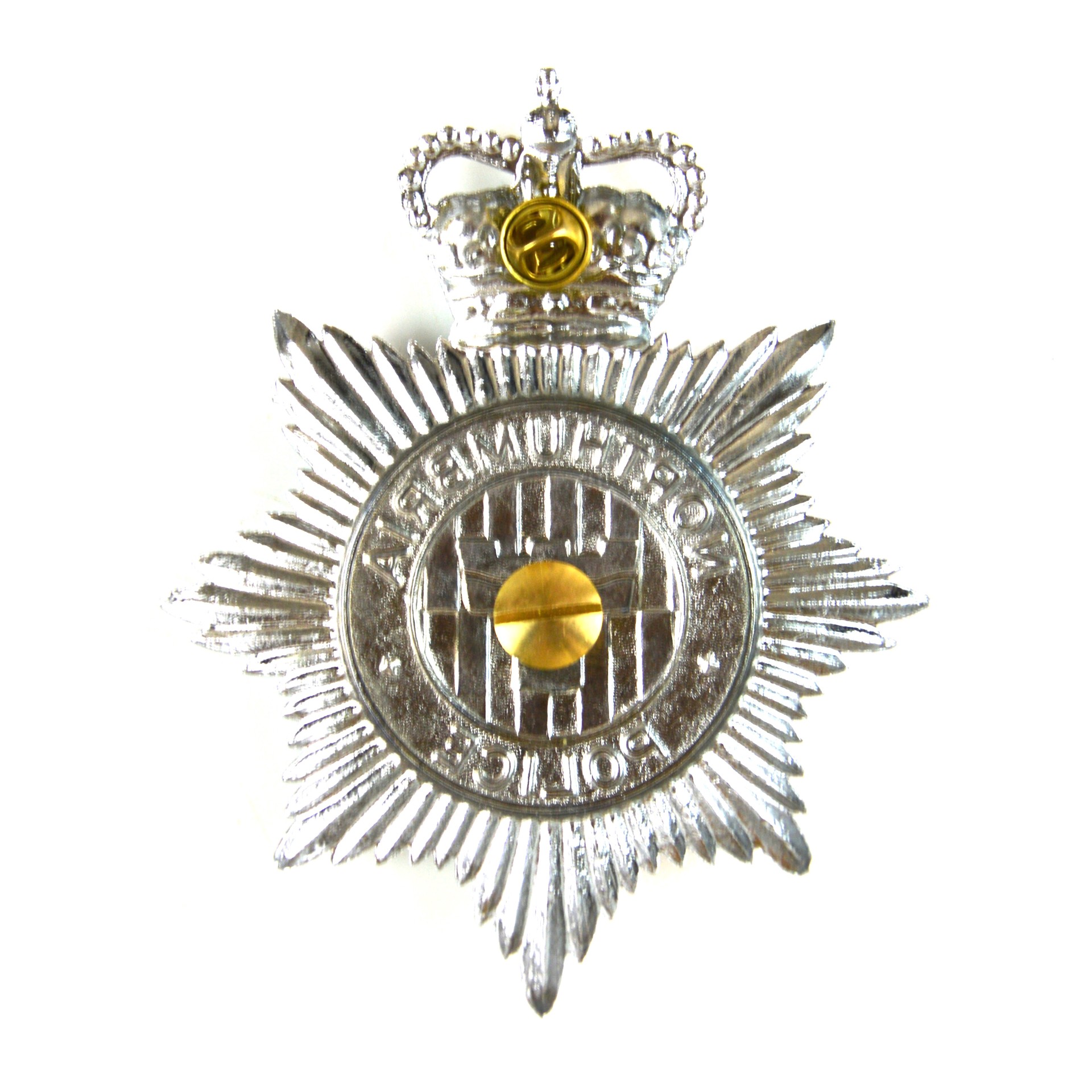 Manufactured in chrome-plated metal with a polished face, the plate reflects the Commonwealth-style police insignia adopted by UK constabularies in the late 20th century. Helmet plates of this type were worn on custodian helmets by serving officers and are collected as examples of contemporary British police memorabilia, Queen’s Crown law enforcement insignia, and regional constabulary uniform hardware. The reverse is fitted with standard fixings for secure attachment to a police helmet.