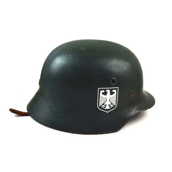 Repainted in with the Bundeswehr emblem transfer on the right side. Complete with an original leather liner and reproduction leather chin strap.