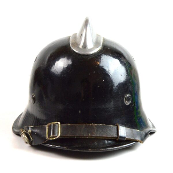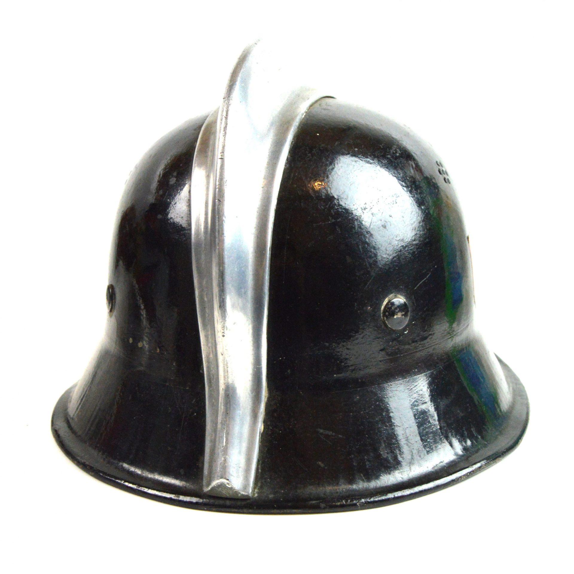 Third Reich Fire Service (Feuerpolitzei) Helmet. Exterior has likely been repainted, with poor quality decals. Complete with an aluminium comb, chinstrap and liner.
