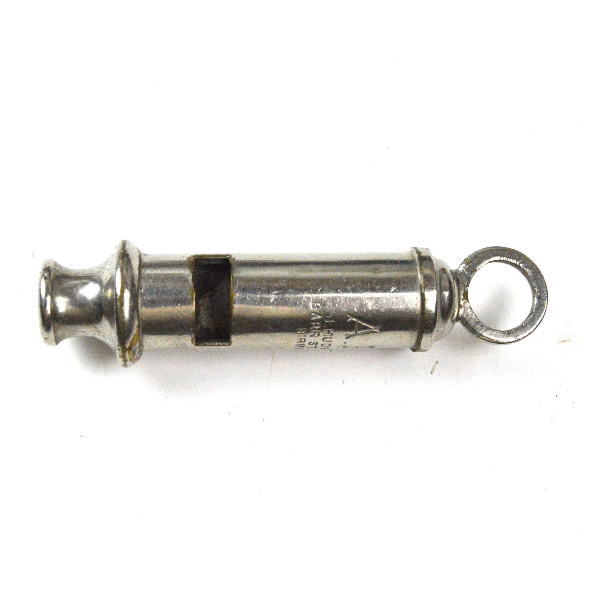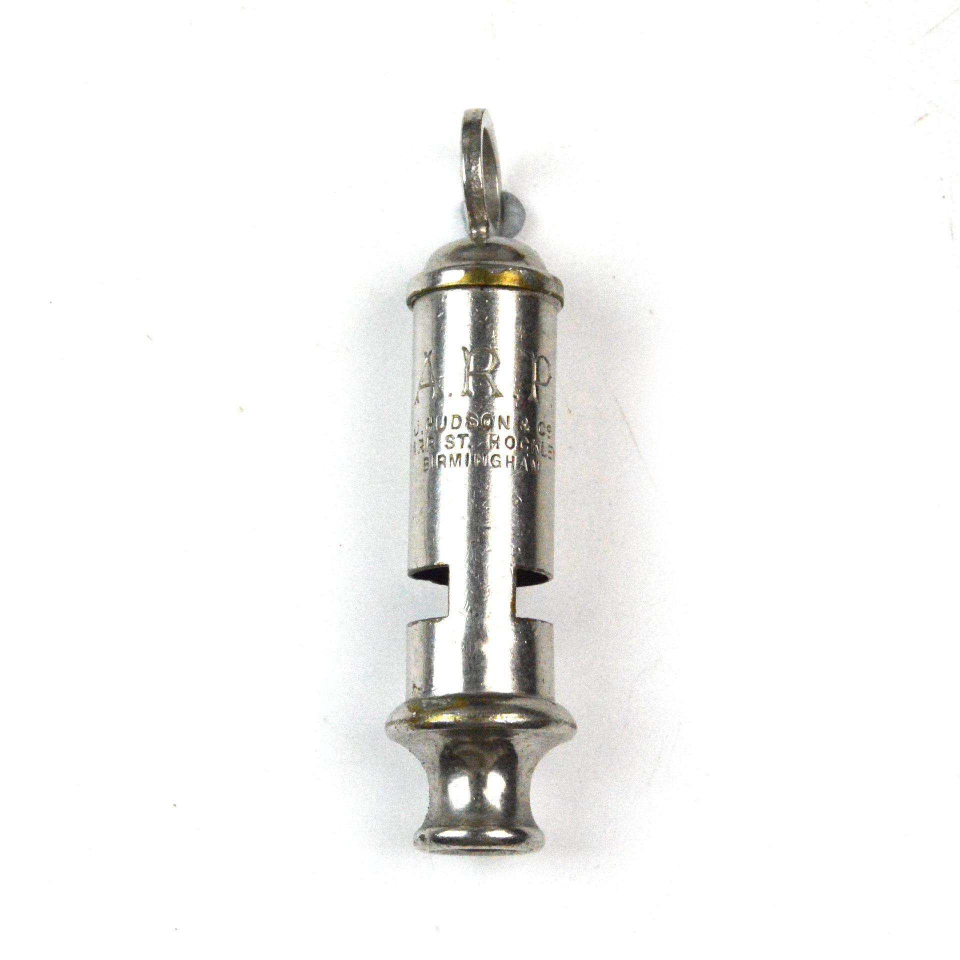 Original WW2 Air Raid Precautions whistle by J. Hudson & Co., Birmingham, in nickel-plated brass with lanyard loop