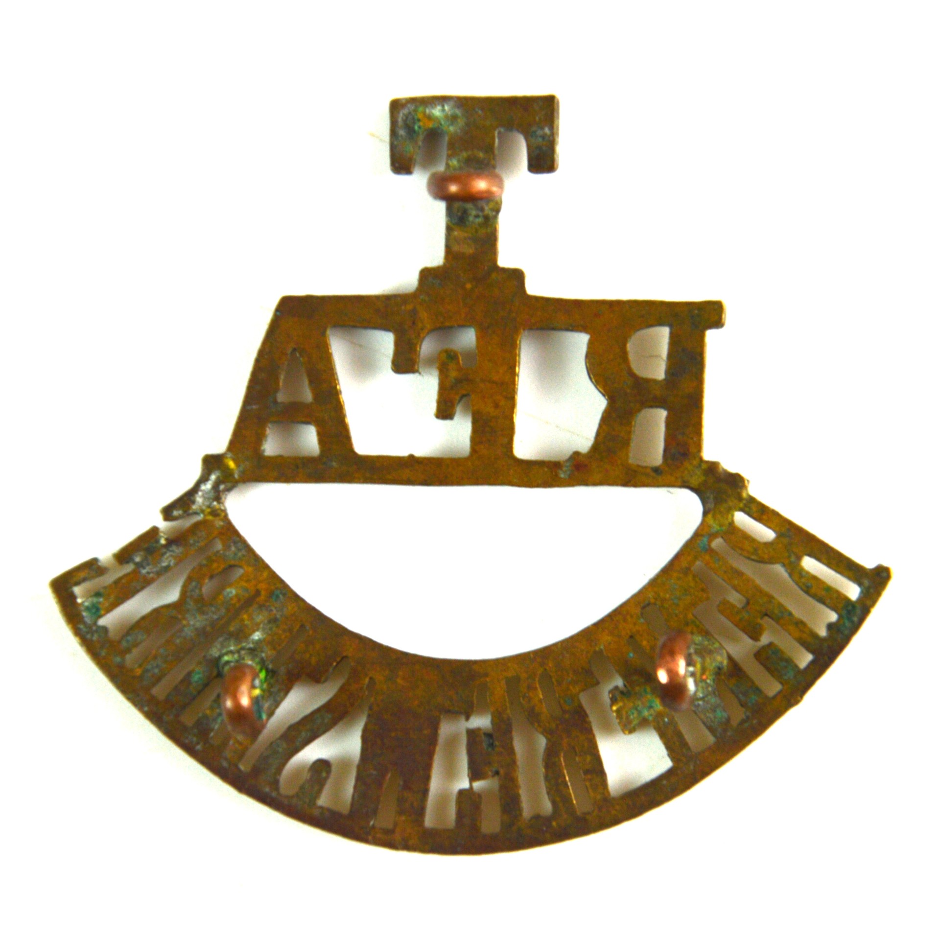 Renfrewshire Batteries, Royal Field Artillery brass shoulder title bearing the designation “T / RFA / RENFREWSHIRE,” produced for wear by Territorial Force artillery units associated with the county of Renfrewshire. This British Army Territorial Force shoulder title reflects early 20th-century organisation, with “T” denoting Territorial service, “RFA” indicating Royal Field Artillery, and “RENFREWSHIRE” identifying the county battery. The lettering is arranged in a clear linear format consistent with First World War and pre-war service dress insignia.