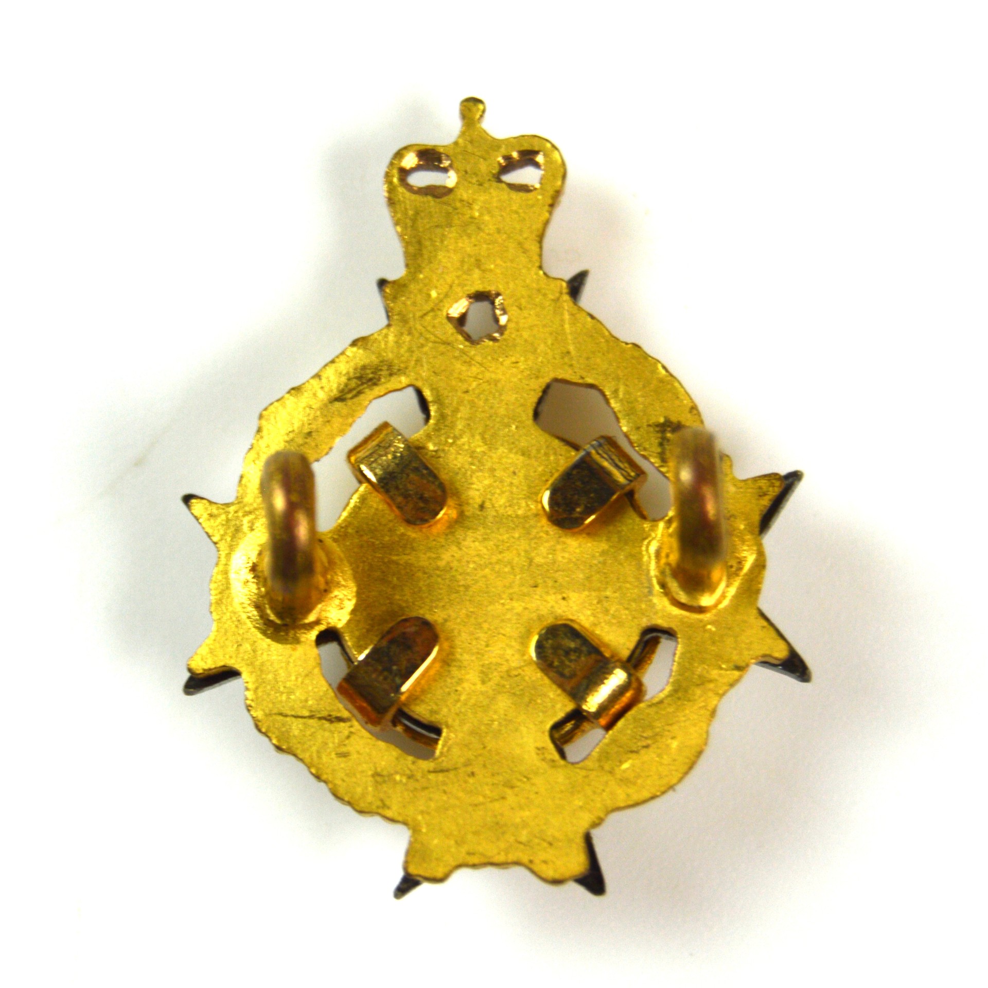 This finely made officer’s badge is die-cast in gilt metal, displaying an open wreath of laurel enclosing a Maltese Cross with the crown above, and a central tablet bearing the motto “In This Sign Conquer”. The reverse retains the correct two-loop fittings, consistent with officers’ issue post-1953.