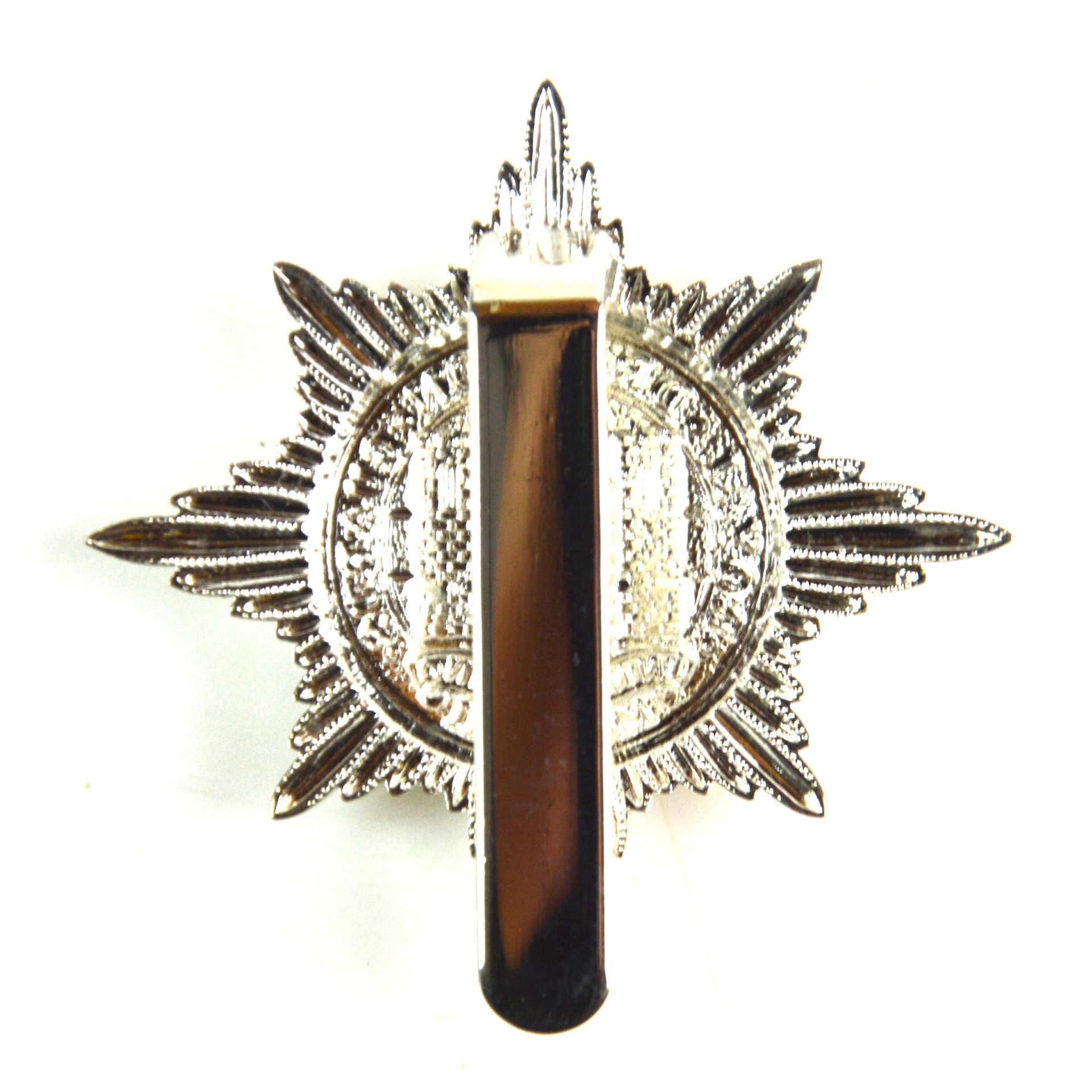 Royal Dragoon Guards cap badge produced in silver plate with enamel detailing, representing the authorised pattern worn by the regiment following its formation in 1992. This British Army cavalry cap badge displays the recognised Royal Dragoon Guards insignia, incorporating the Inniskilling castle, St. George’s cross and circlet reading “Royal Dragoon Guards / MCMXCII” on a Garter Star rendered in fine relief and enhanced by red and blue-coloured enamel elements.