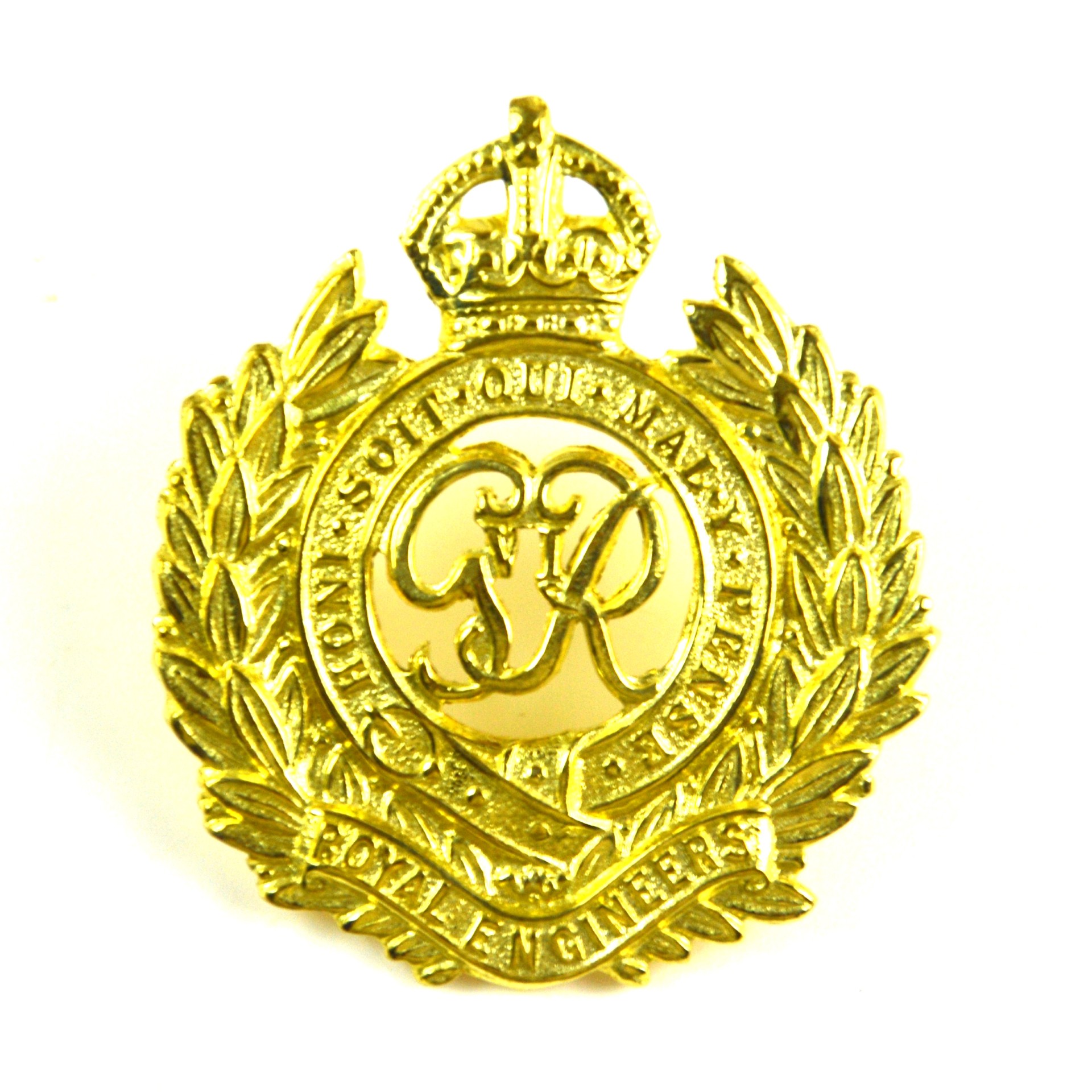 Royal Engineers cap badge produced as a restrike of the GRVI 1937–1948 pattern, representing the design worn during the reign of King George VI, including the period of the Second World War. This British Army corps cap badge displays the recognised Royal Engineers insignia in clear relief, incorporating the King’s crown above the traditional laurel wreath and GRVI cypher central device, with the Royal motto in a circlet and “Royal Engineers ” in a scroll beneath, arranged in the formal and balanced composition characteristic of British Army headdress insignia.