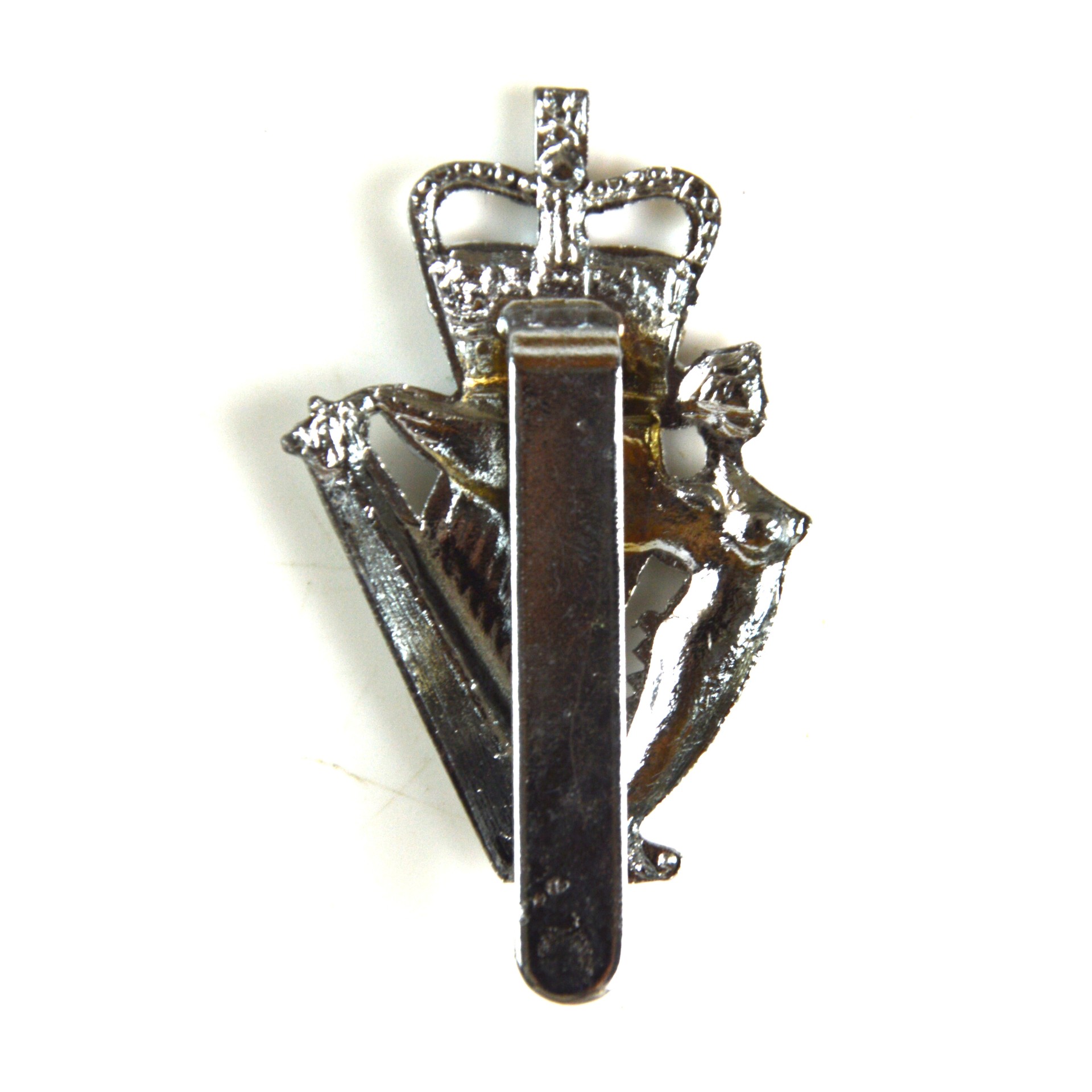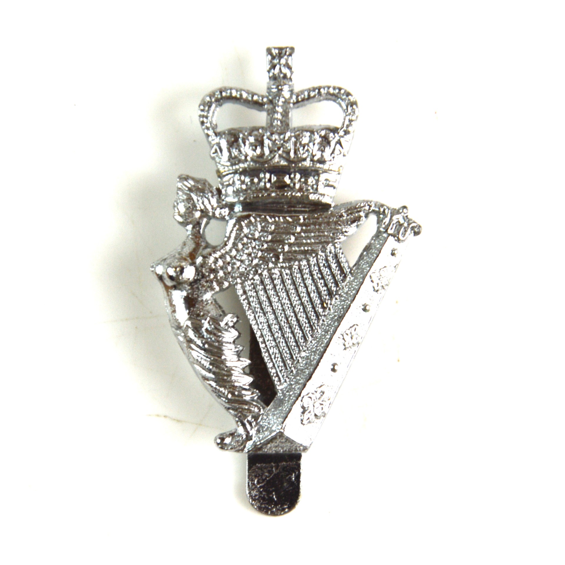 Manufactured in nickel-plated white metal consistent with modern British Army beret insignia, this example represents the lightweight pattern widely adopted for everyday service dress. Royal Irish Regiment cap badges are collected as examples of contemporary British Army militaria, Irish regimental insignia, and modern uniform hardware.