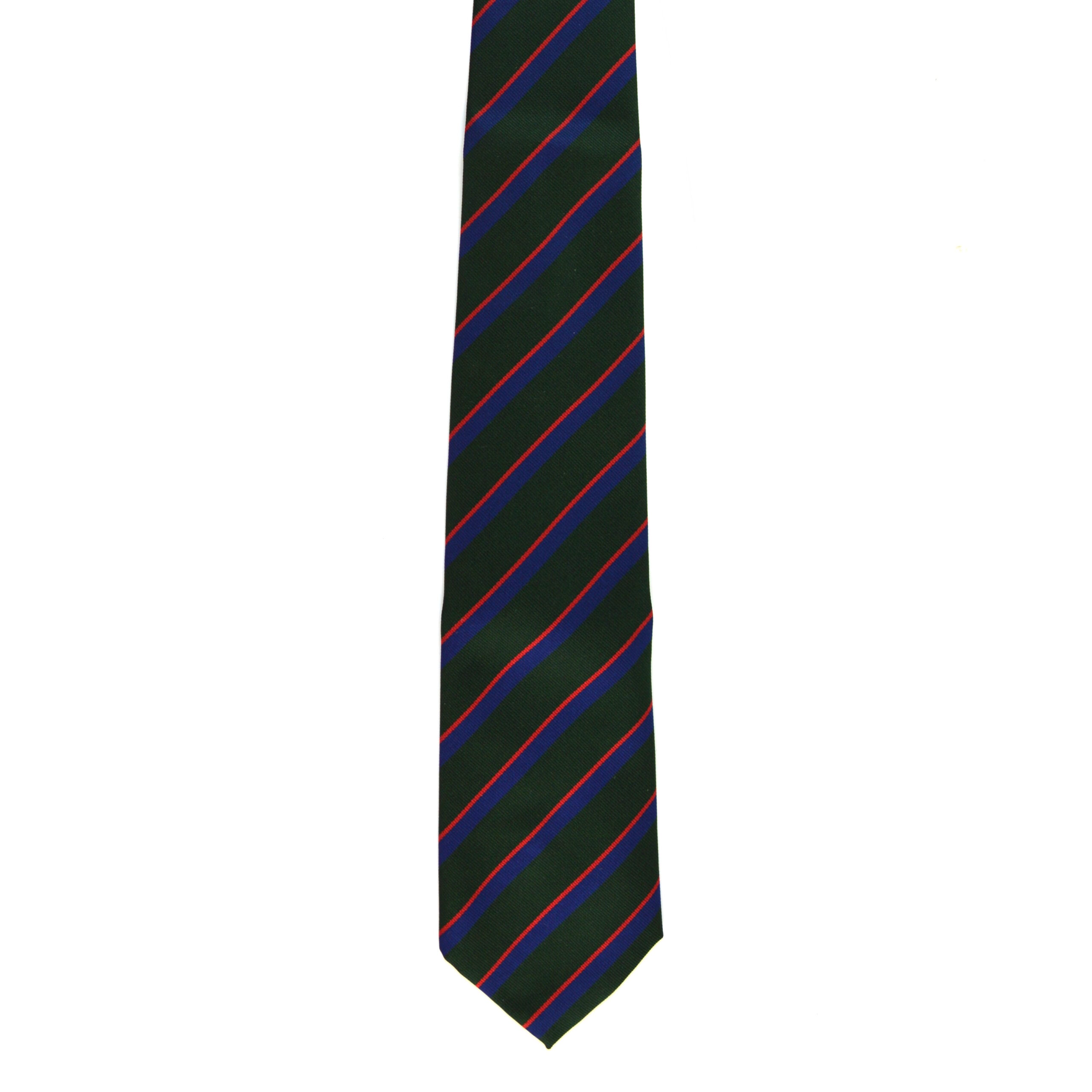 A high-quality Royal Irish Regiment (RIR) regimental polyester tie, featuring the regiment’s distinctive dark blue and red stripes on a rifle green background in traditional military styling. Designed to reflect the proud heritage of the Royal Irish Regiment (RIR), this tie is suitable for formal occasions, veterans’ reunions, association events, or everyday smart wear.