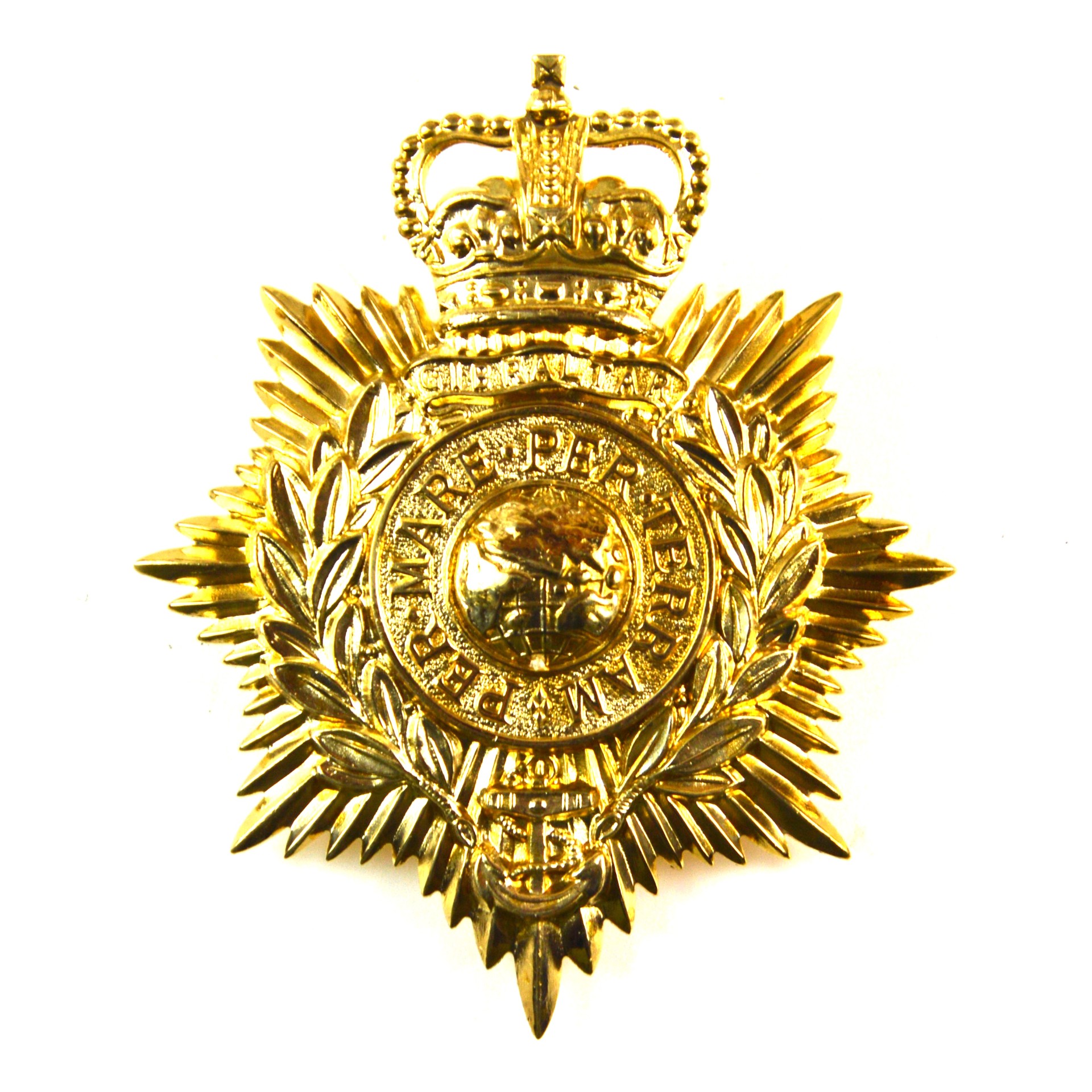 Manufactured in gilding metal, the plate displays strong relief and well-defined detailing to the globe, wreath, and crown. Original examples such as this were intended for wear rather than display, and the quality of manufacture reflects formal dress standards of the period. The reverse is fitted with the correct eyed lug fixings for mounting to a helmet.