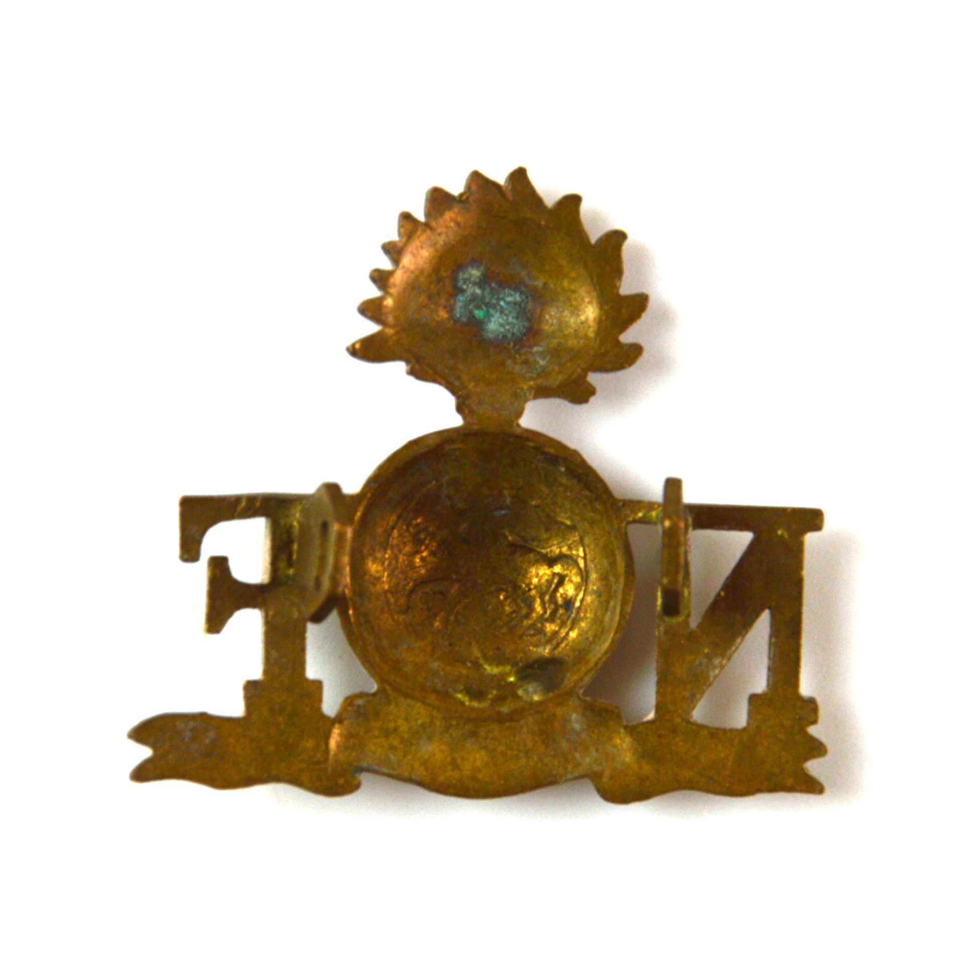 The title bears the regiment’s initials “NF”, separated by a flaming grenade and scroll that reads “Royal”, produced in gilding metal for attachment to battledress and service dress uniforms. As an original example rather than a later restrike, it represents an authentic piece of regimental insignia worn by serving soldiers of the period.