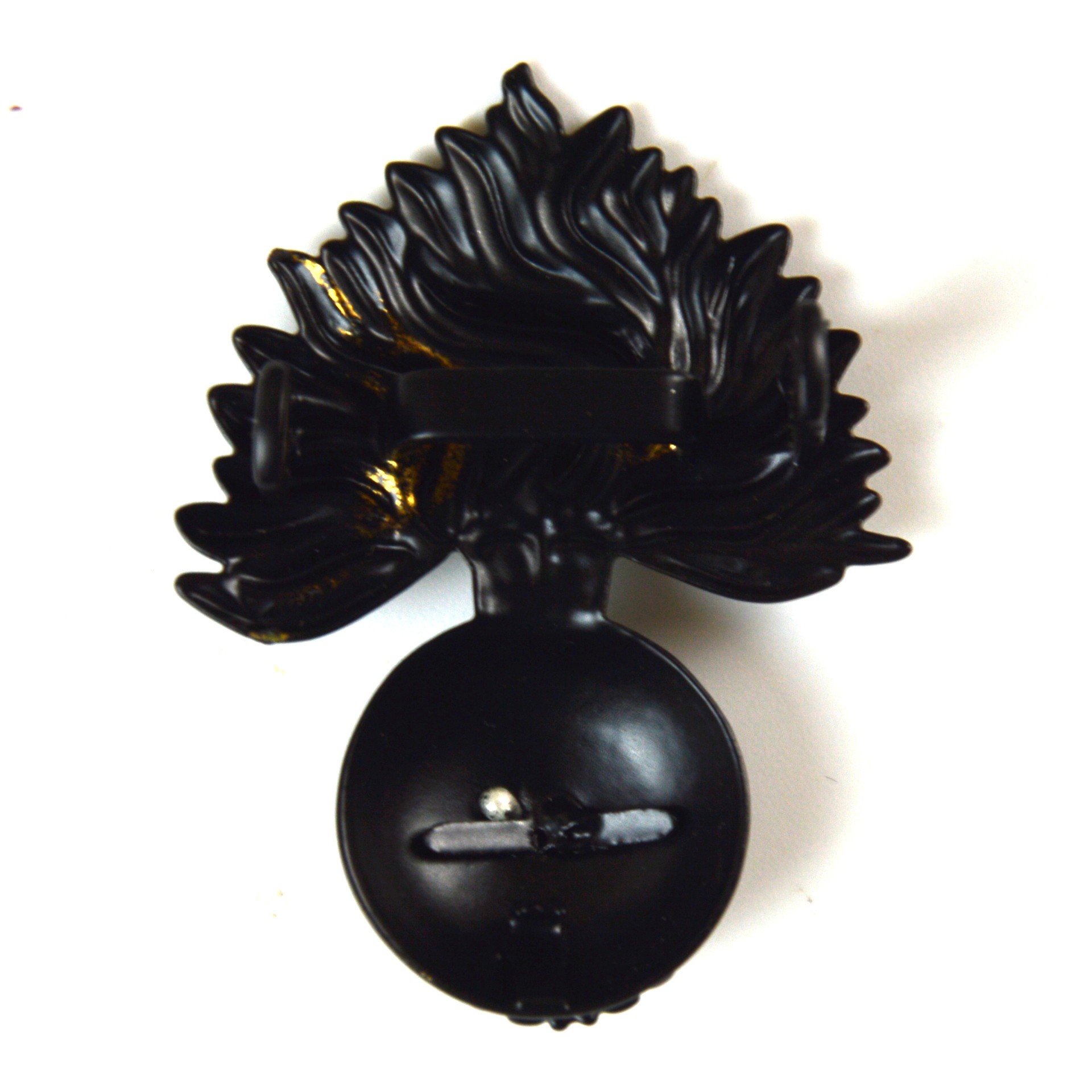 A modern restrike example of the Royal Regiment of Fusiliers cap badge, produced in blackened brass to emulate the subdued finish commonly used on field-service insignia in Northern Ireland.