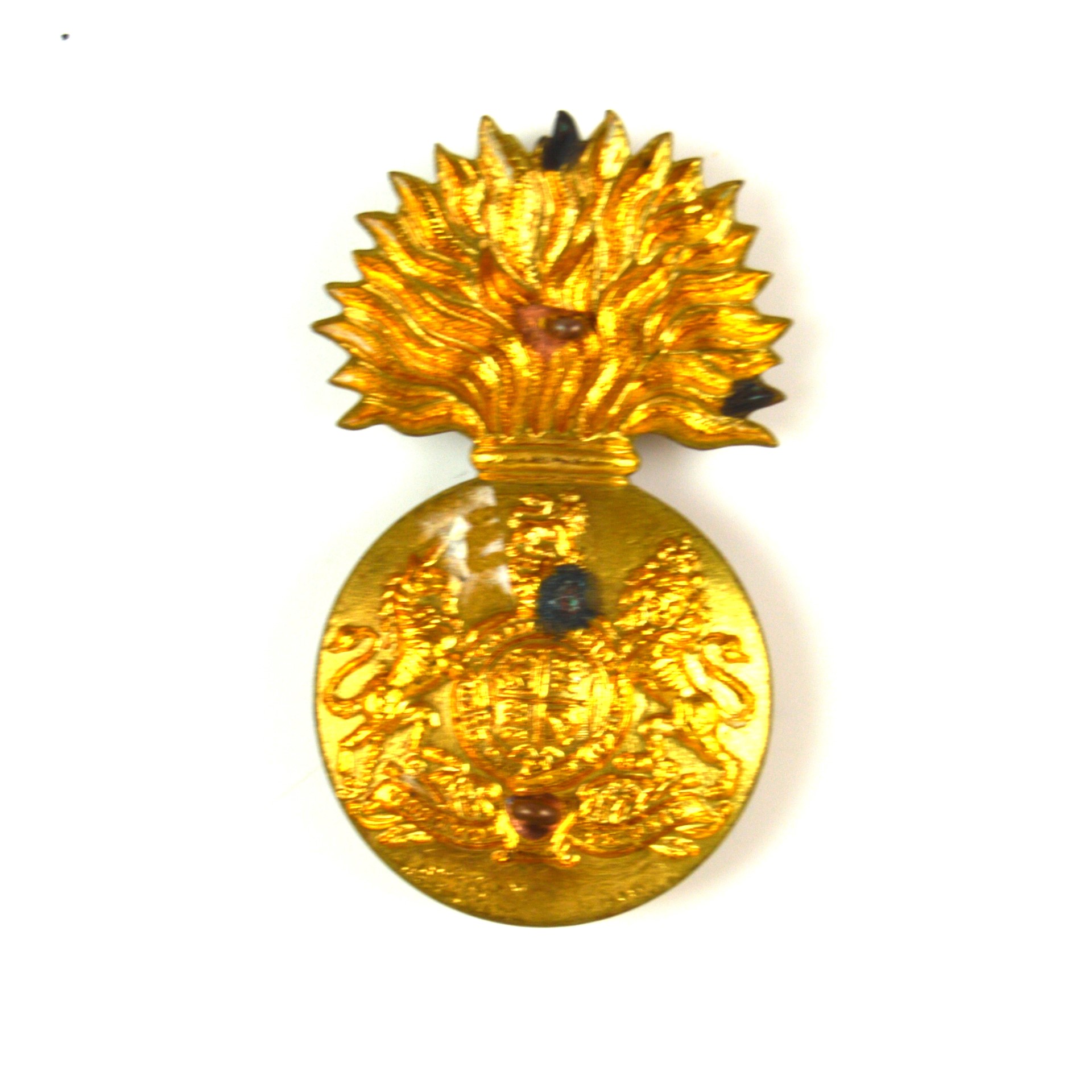 The design features the iconic flaming grenade with the Royal Coat of Arms in the centre, surmounted by the Queen’s Crown, die-struck in gilding metal. North-south eyed lugs on the reverse for wear