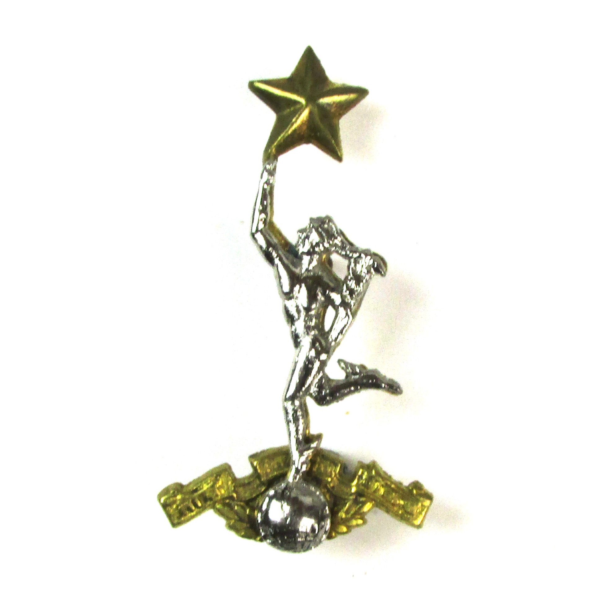 Indian Army Corps of Signals cap badge, featuring the figure of Mercury, the Roman messenger god, standing atop a globe and holding a star. This design has remained unchanged since its adoption after Indian independence in 1947.