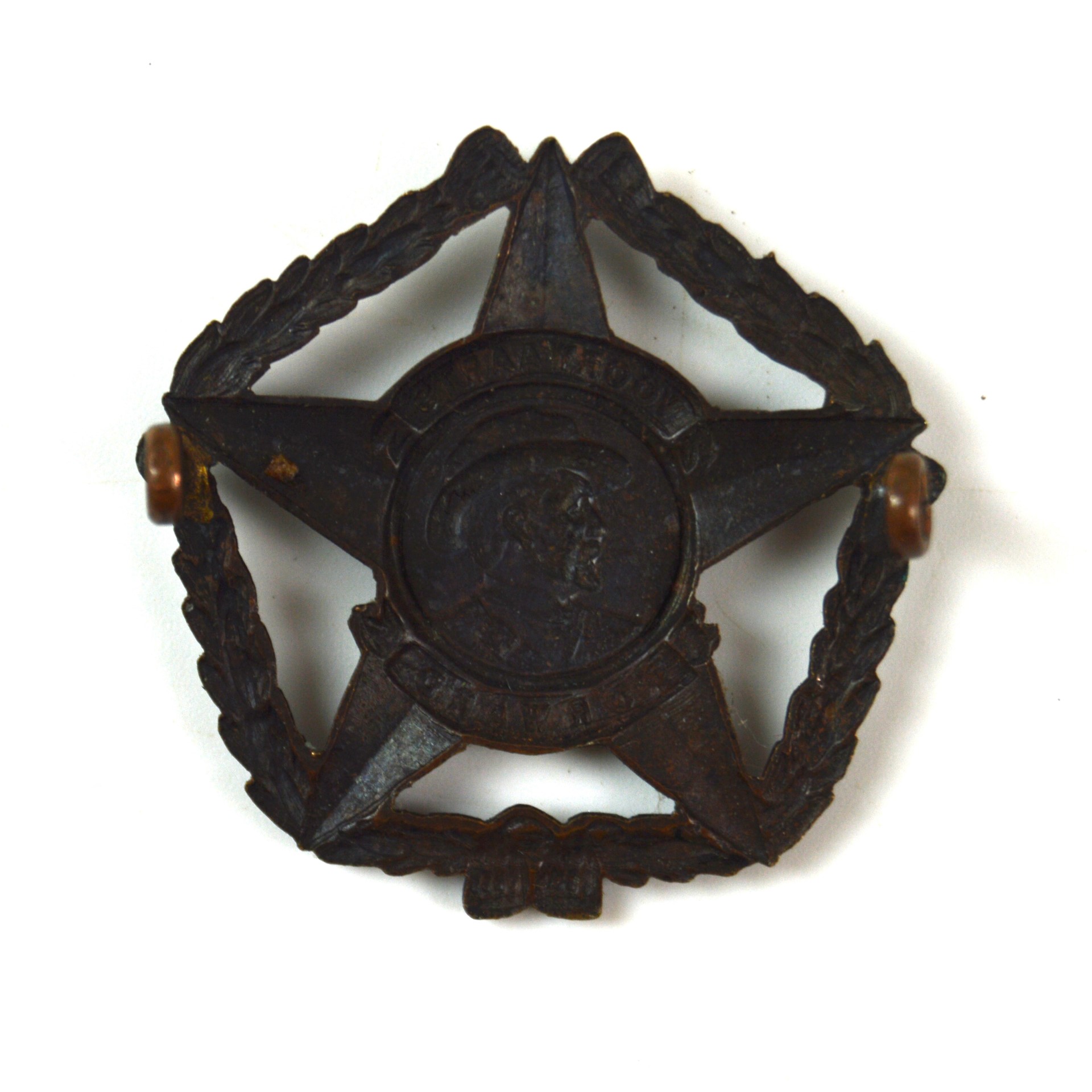 The badge is struck in blackened brass and features a side profile of General Botha in the circular plaque with the bilingual scrolls “Voorwaarts / Forwards” positioned north and south, all within a wreathed 5-point star. The reverse is fitted with east-west-eyed loop fittings for attachment to the service cap.