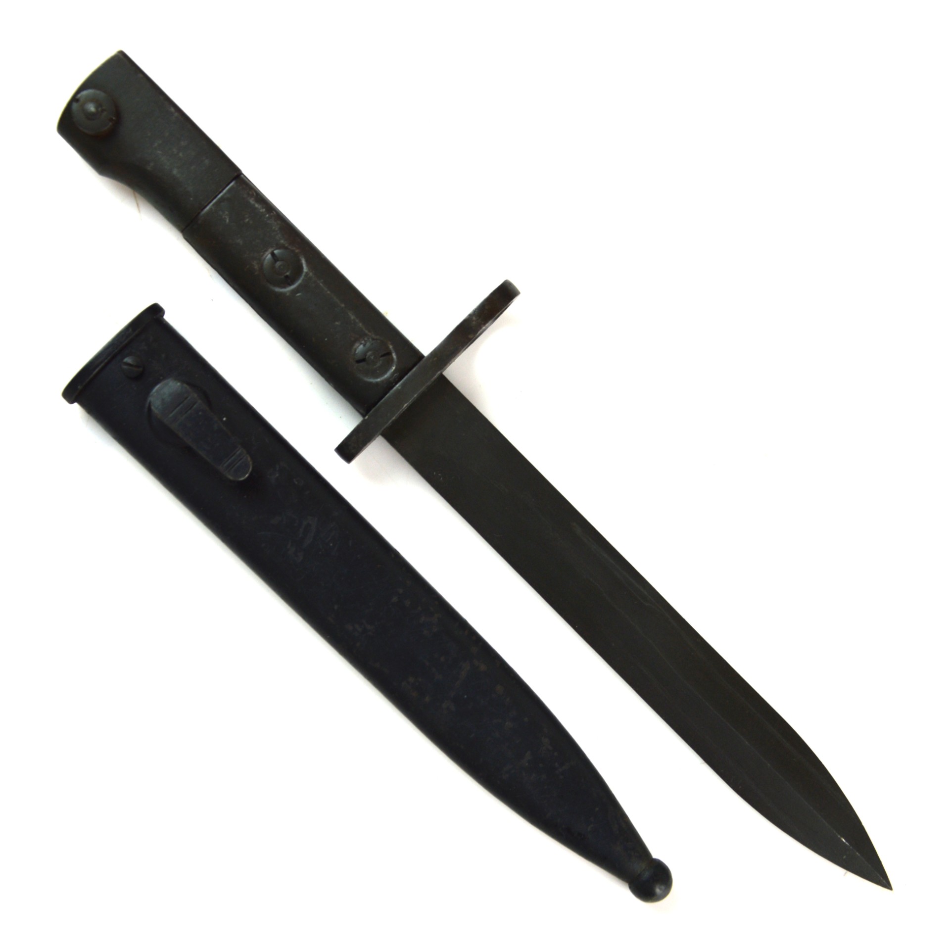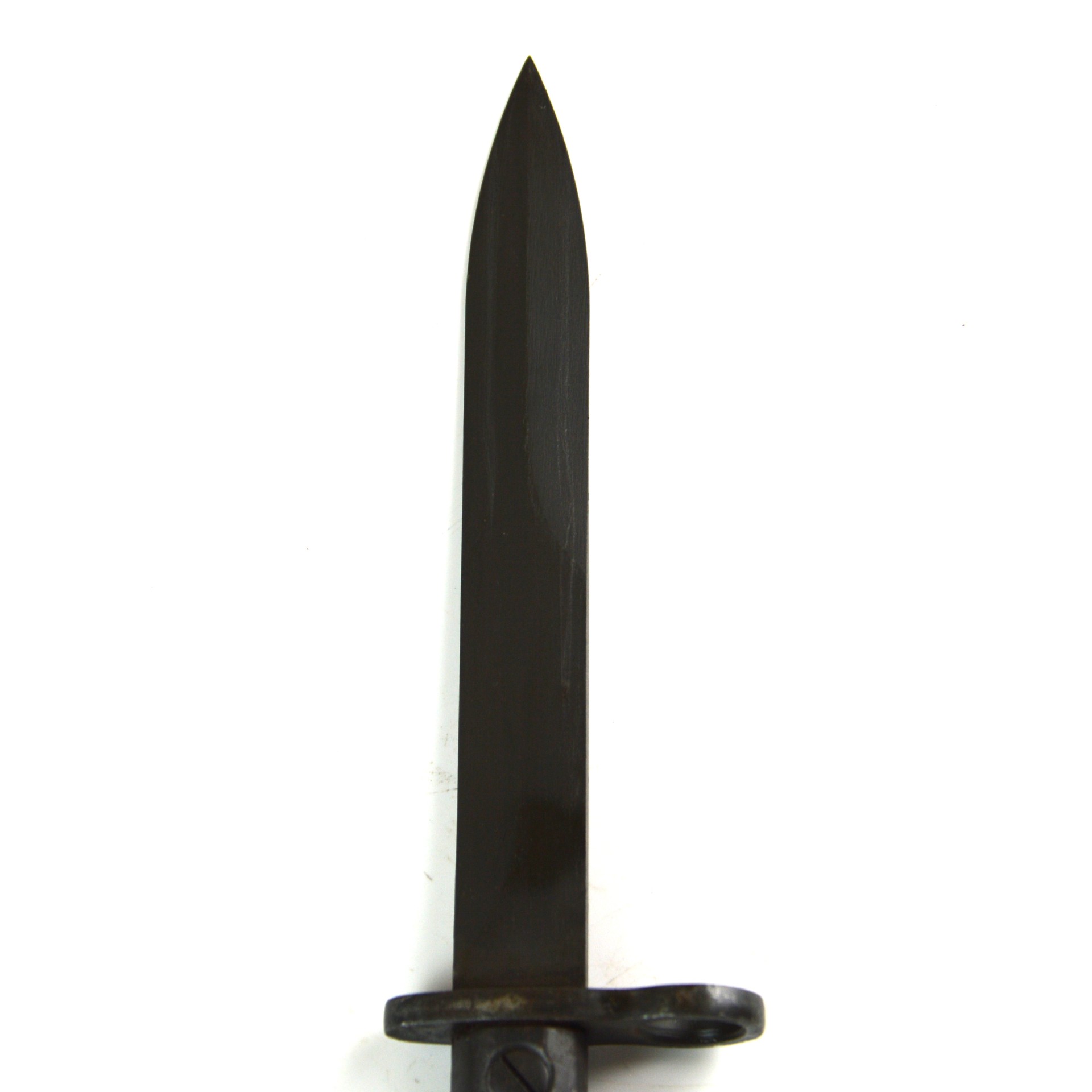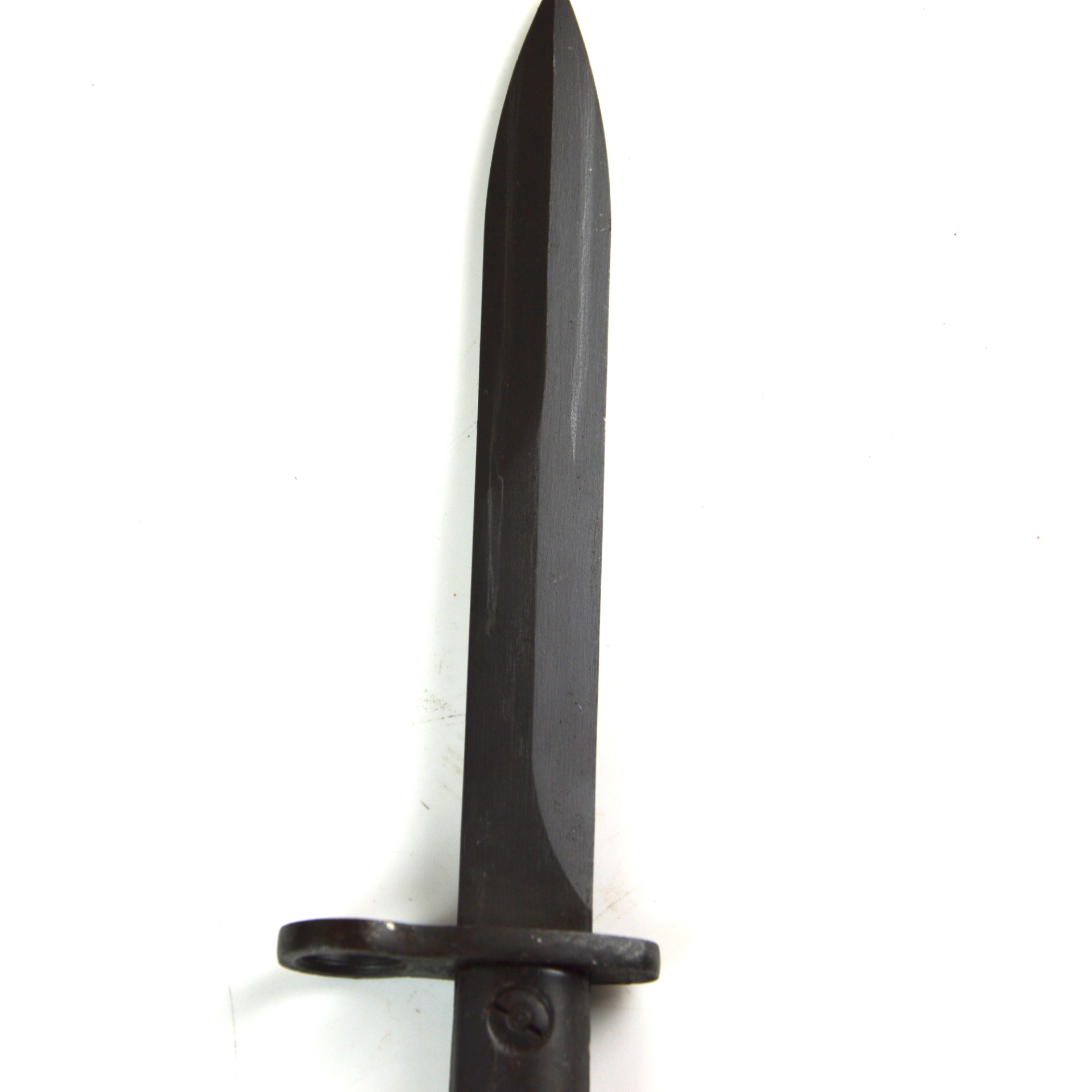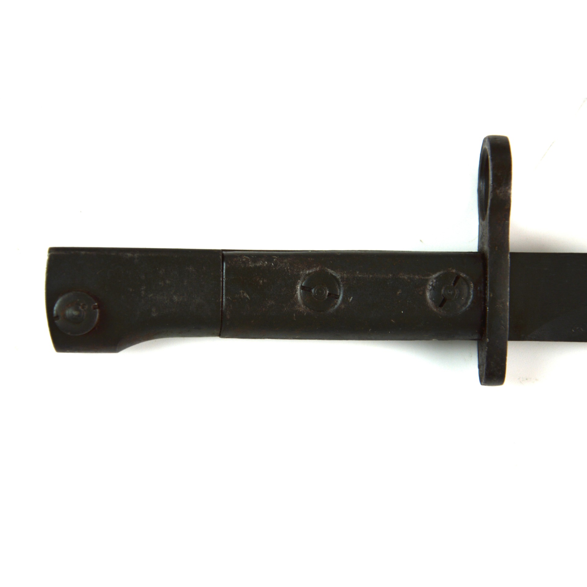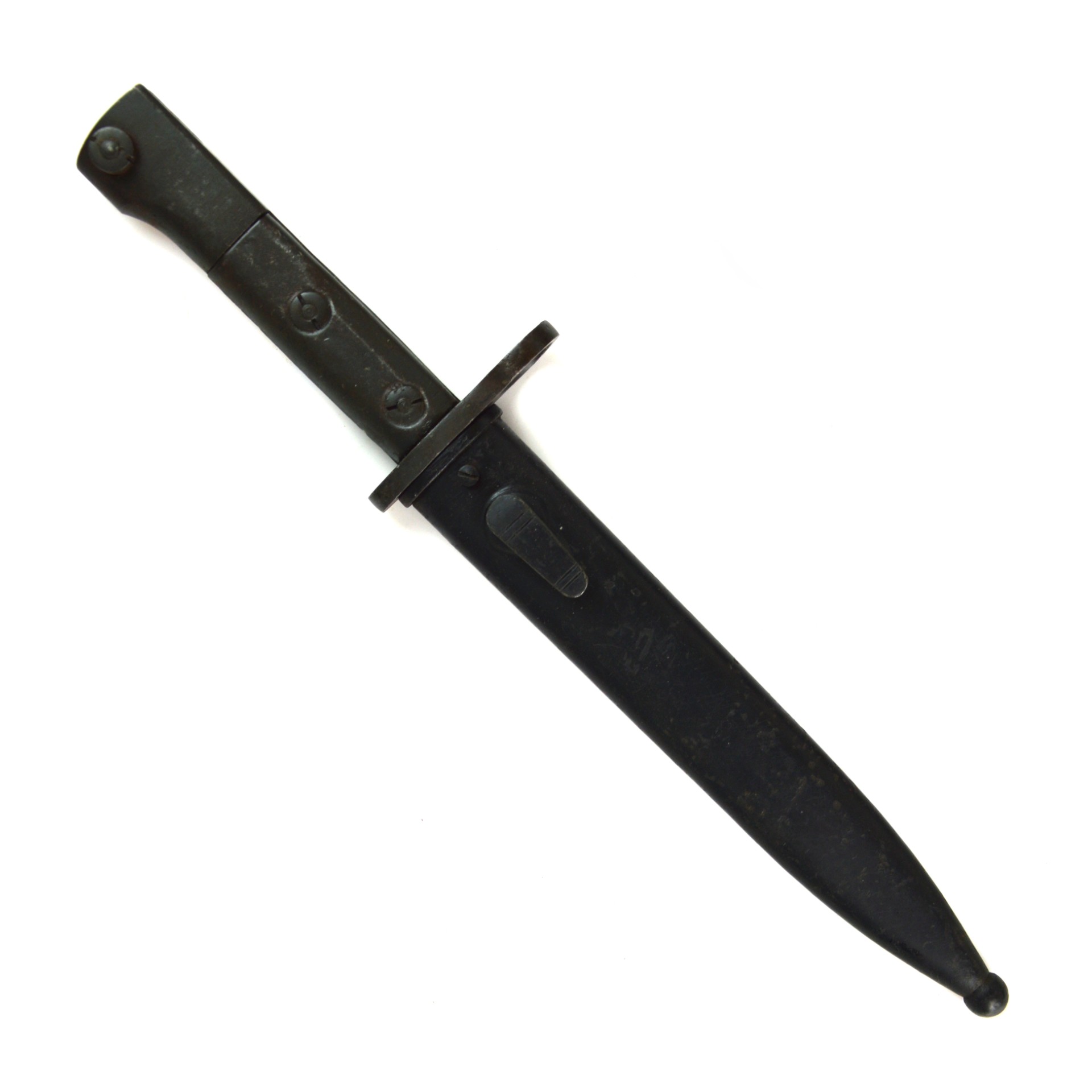 An original South African S1 pattern bayonet intended for use with the South African issue Uzi submachine gun, complete with its period steel scabbard and webbing frog. The bayonet is a simple Belgian-inspired design with a US M3-style single false-edged parkerised blade, steel slab grips and a press-stud release catch on the pommel. No maker’s marks visible other than a number “1” on the tang.