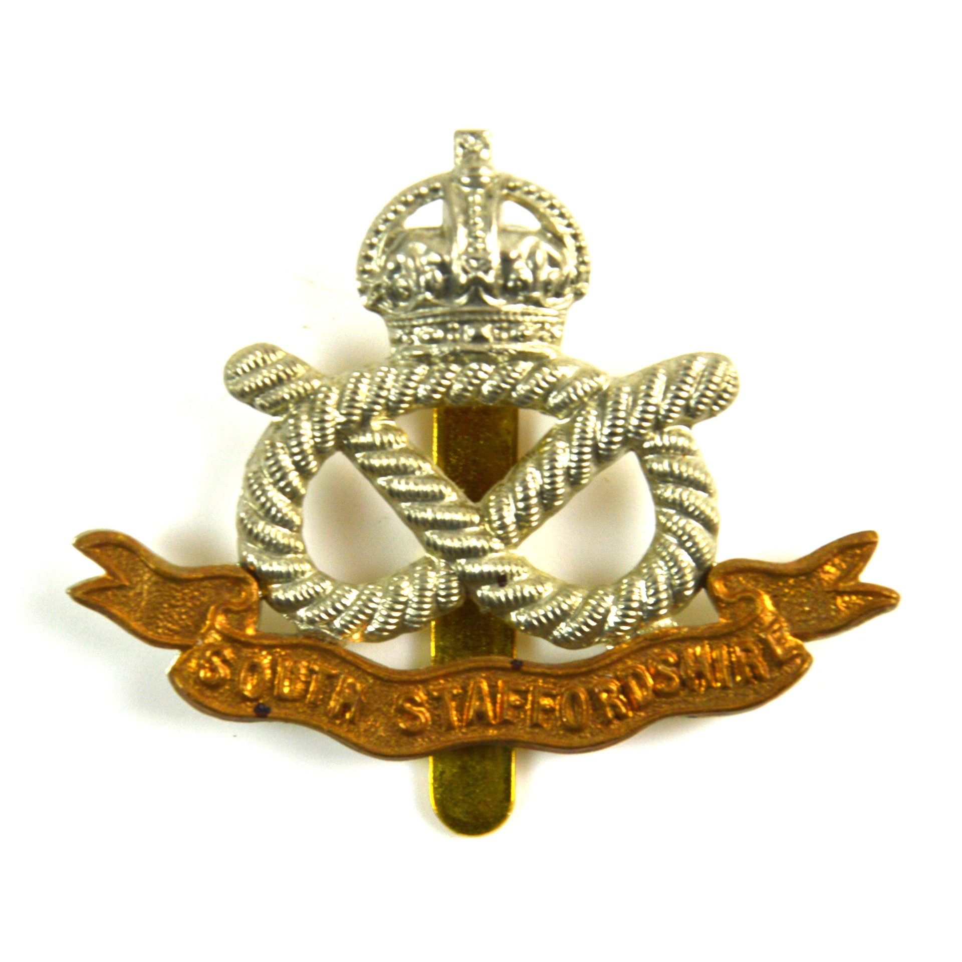 South Staffordshire Regiment cap badge produced as a restrike of the 1901–1953 pattern, representing the design worn from the Edwardian period through the First and Second World Wars and into the post-war period. This British Army infantry cap badge displays the recognised South Staffordshire Regiment insignia in clear relief, incorporating the Stafford Knot and regimental scroll “South Staffordshire”, surmounted by the King’s Crown. The overall composition follows the formal, balanced arrangement typical of early- to mid-20th-century British Army cap badges.