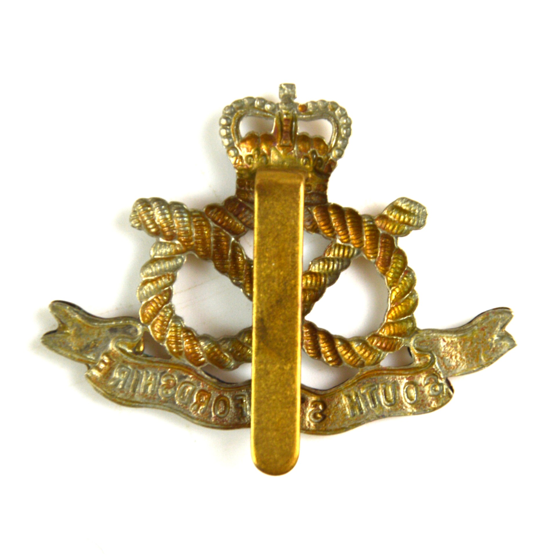 Manufactured in bimetal (brass and white metal) consistent with service dress wear, this restrike example provides a sharply defined representation of the traditional regimental pattern. South Staffordshire Regiment cap badges are collected as examples of British Army infantry militaria, regimental insignia of the Midlands, and historic uniform hardware.